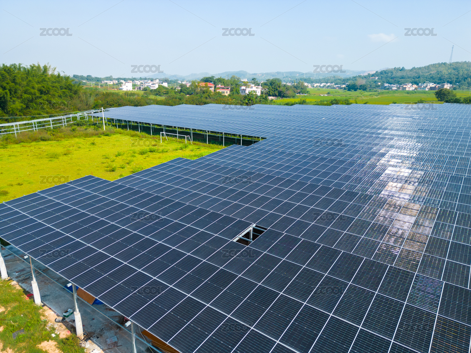航拍俯瞰绿色乡村搭建好的光伏板太阳能发电