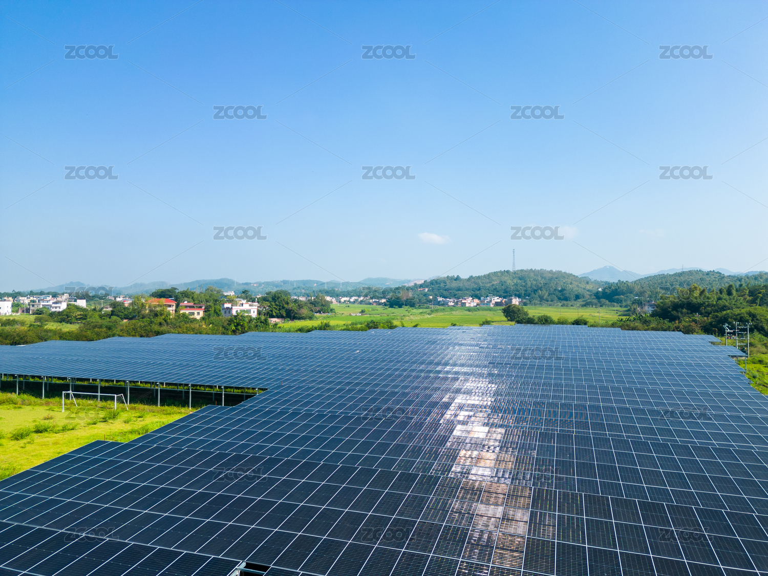 航拍俯瞰绿色乡村搭建好的光伏板太阳能发电