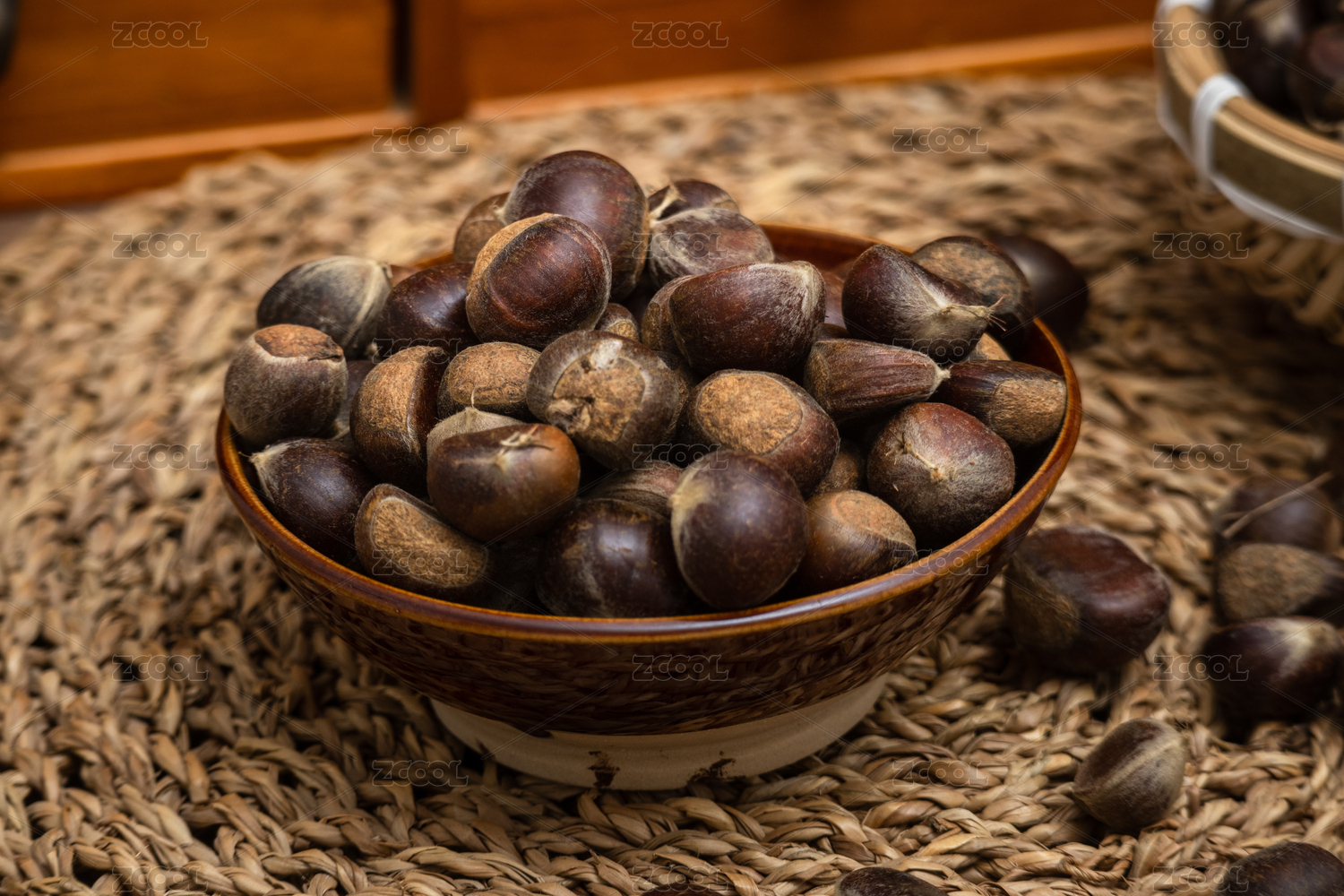桌面碗里装满新鲜采摘下来的野生栗子板栗