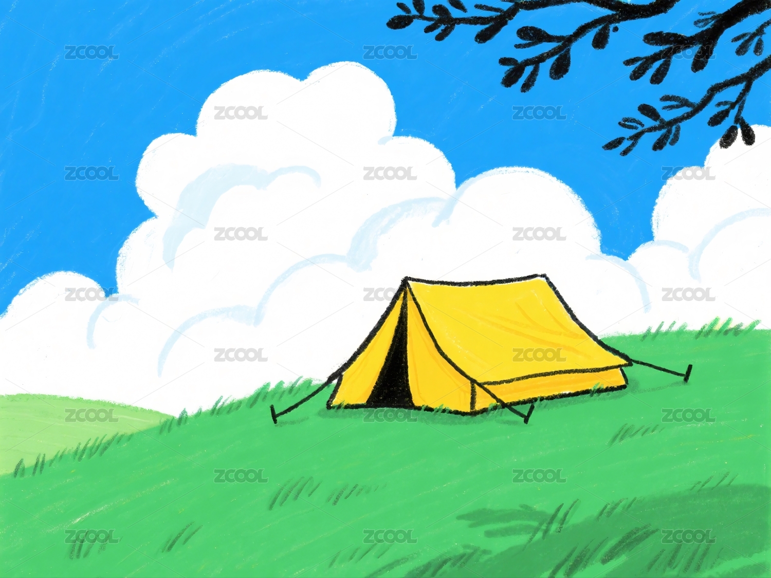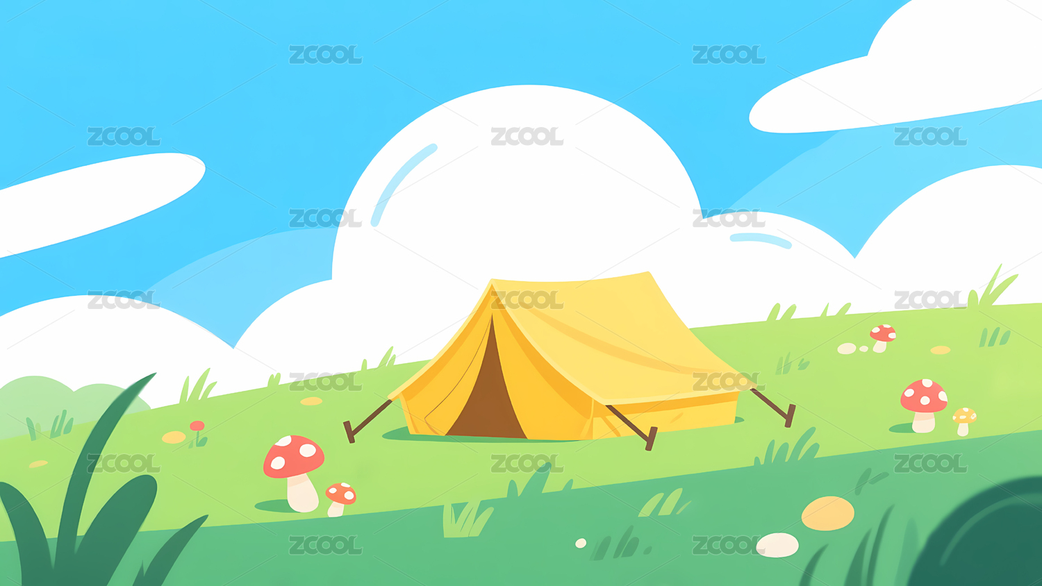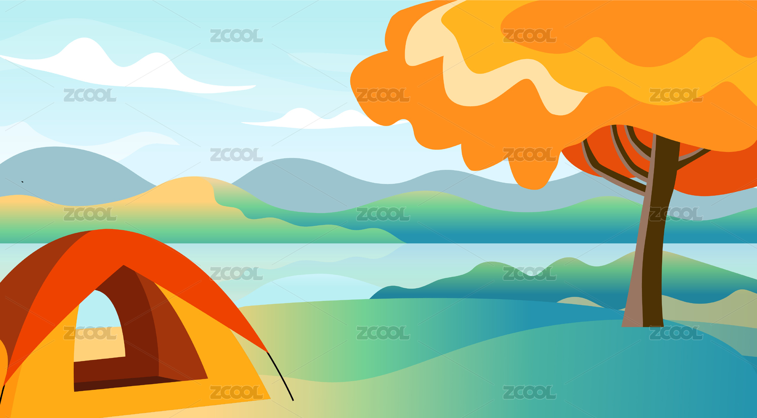 青山绿水春天夏天郊外郊游帐篷露营山水插画