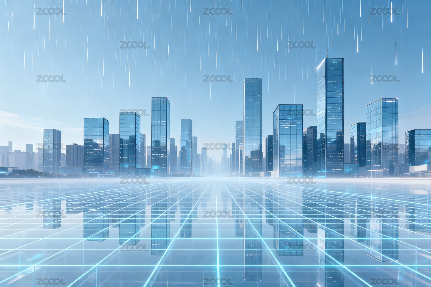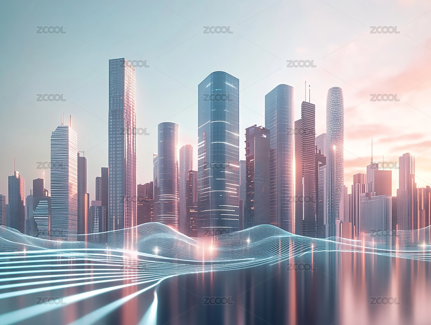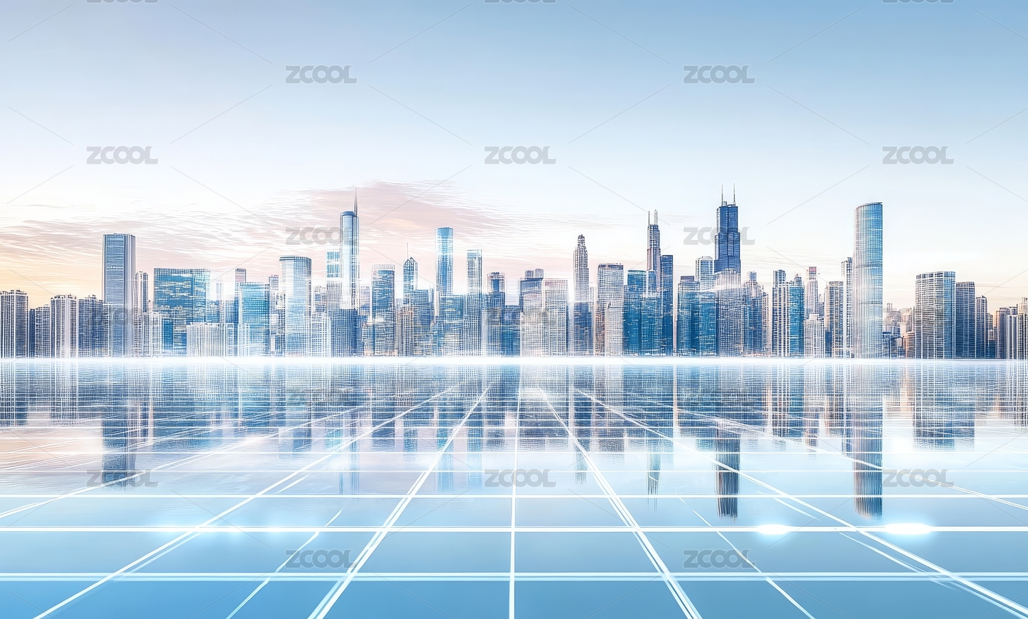 未来城市天际线与网格反射