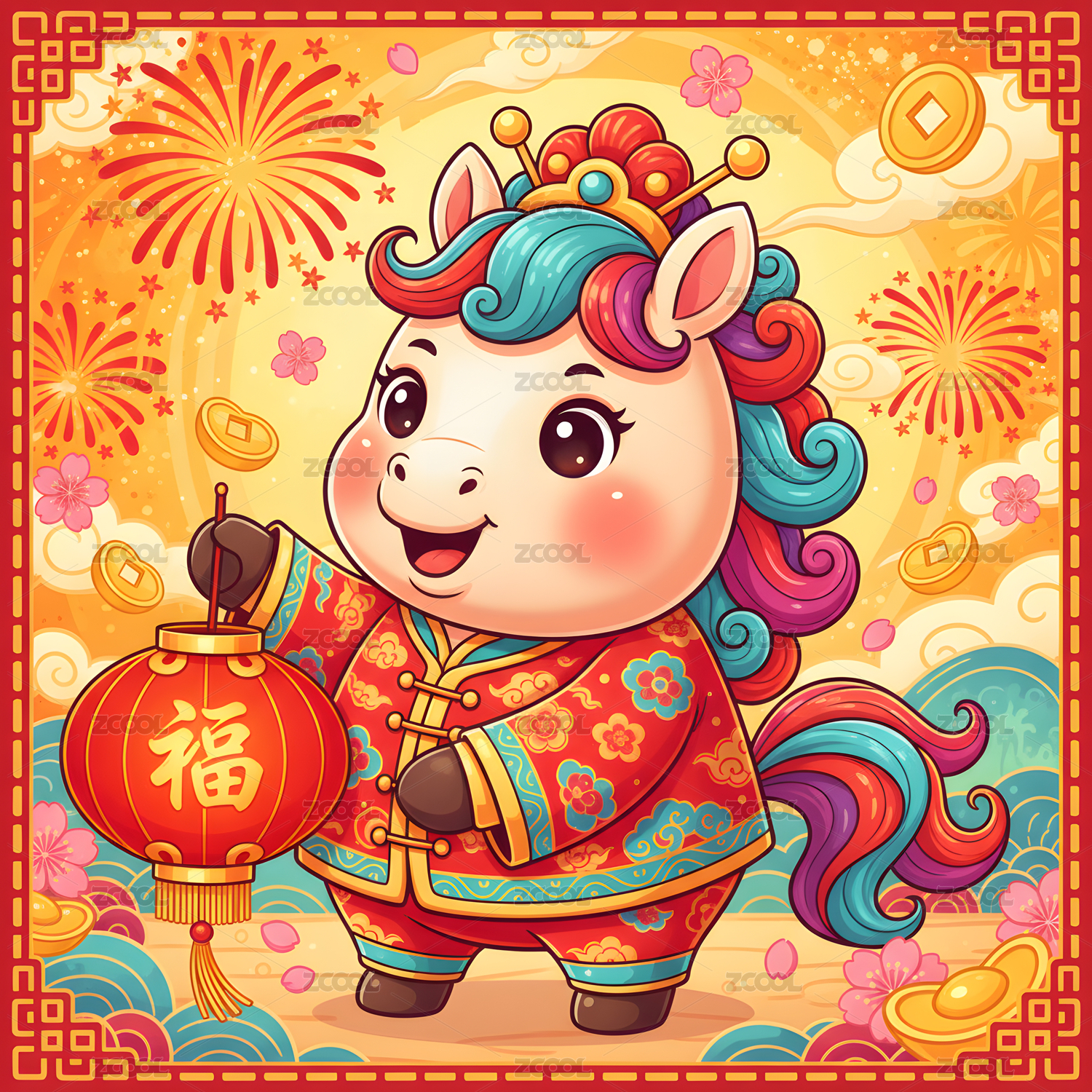 装饰小马与灯笼金元宝的春节场景