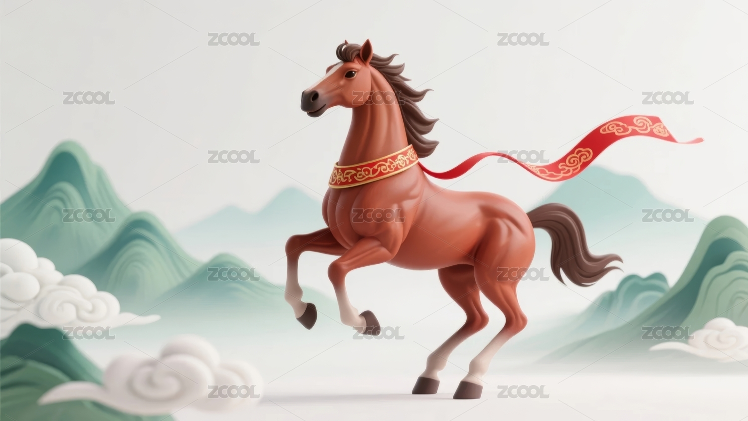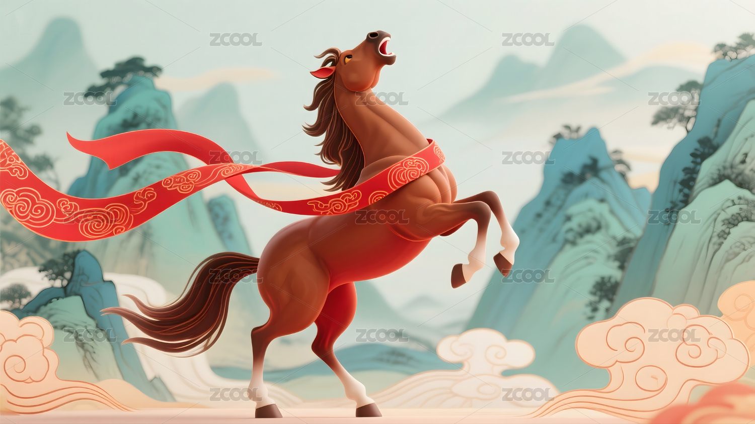 奔马在青绿山峦与灯笼祥云中展现清新国潮气