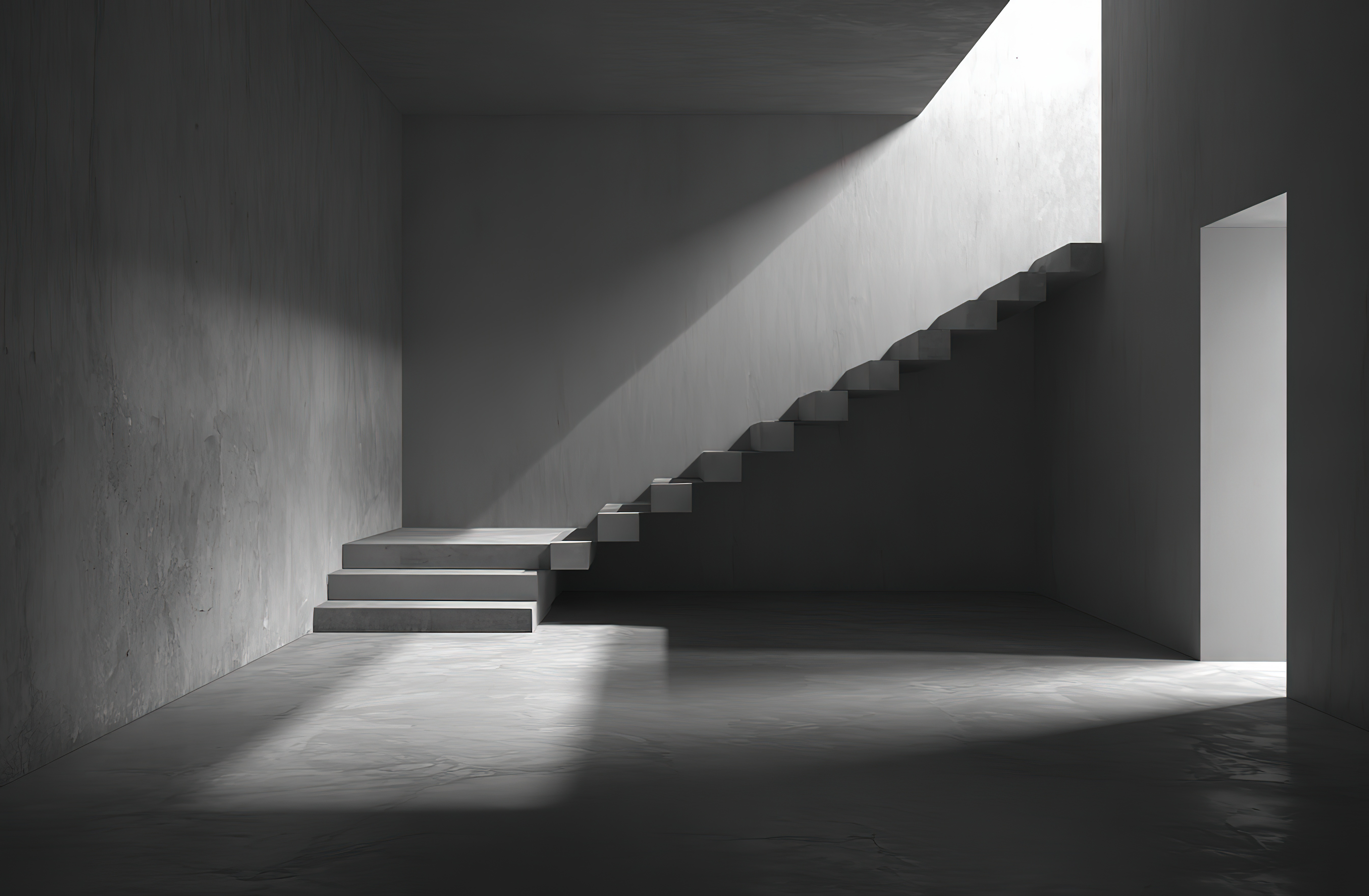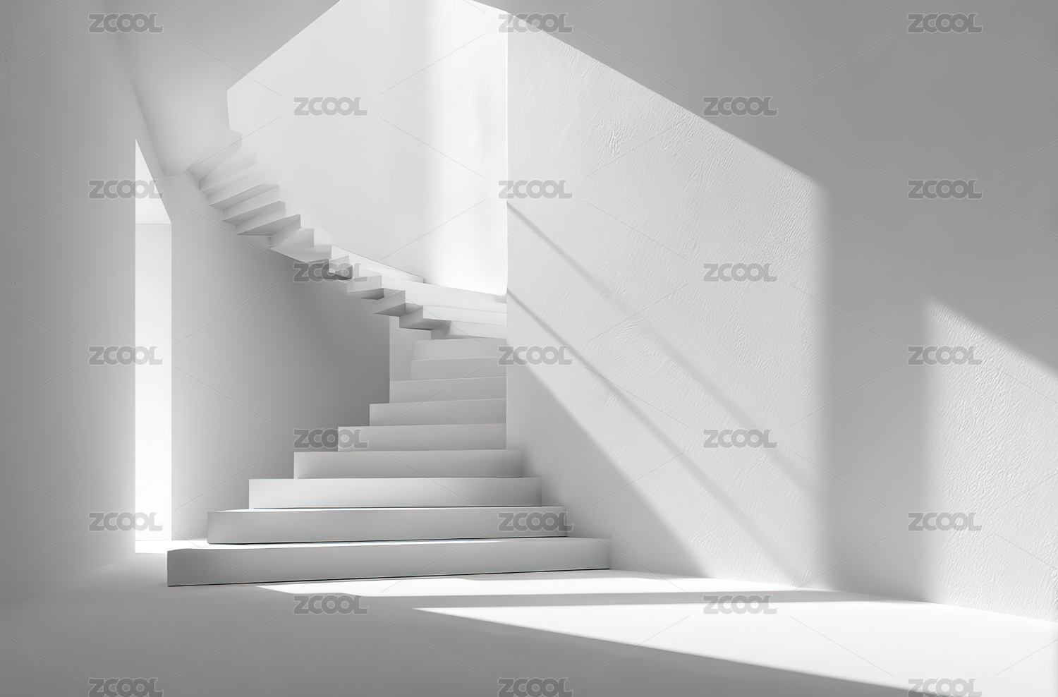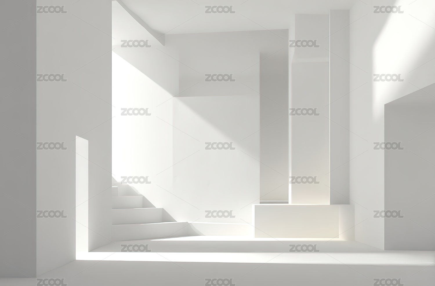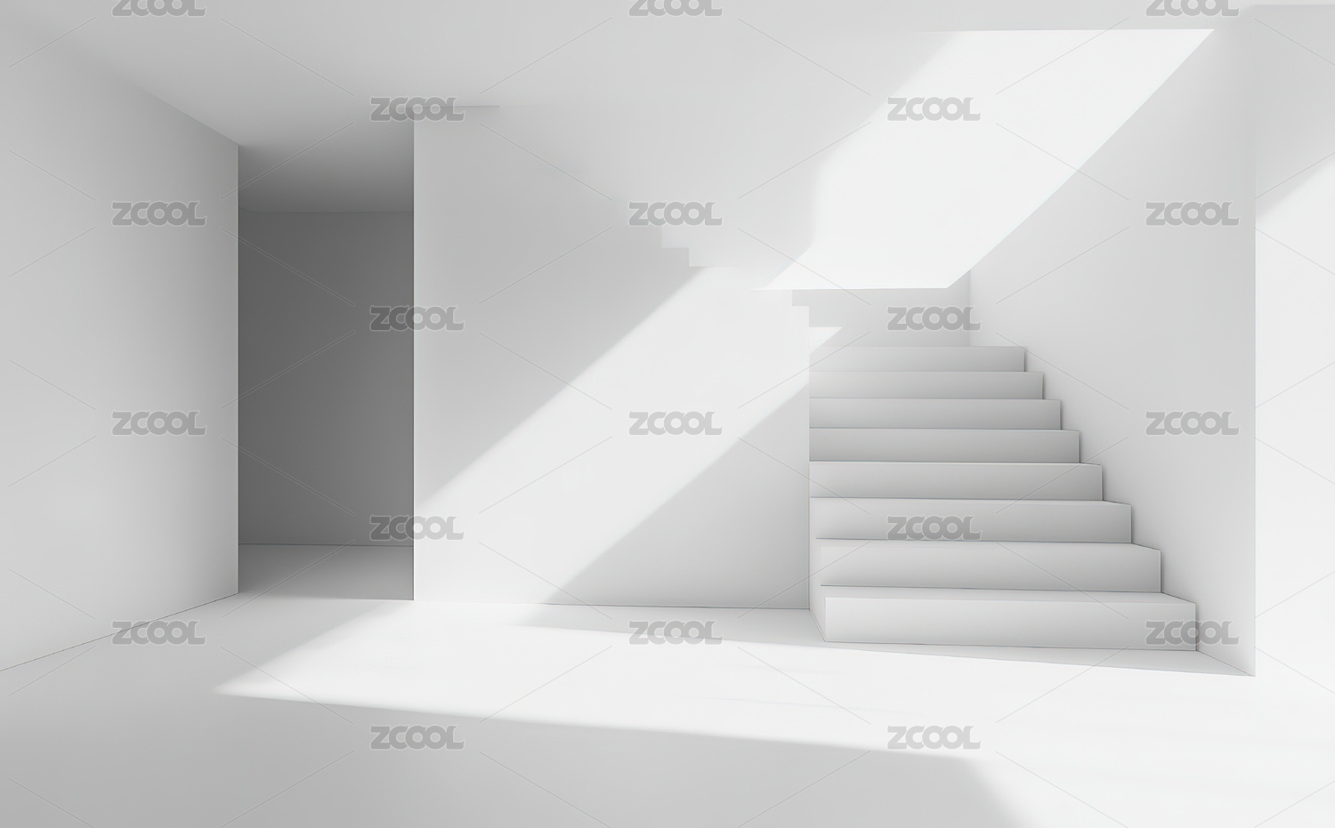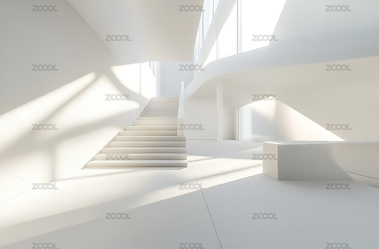 白色简洁有楼梯通往天台的室内空间3D渲染
