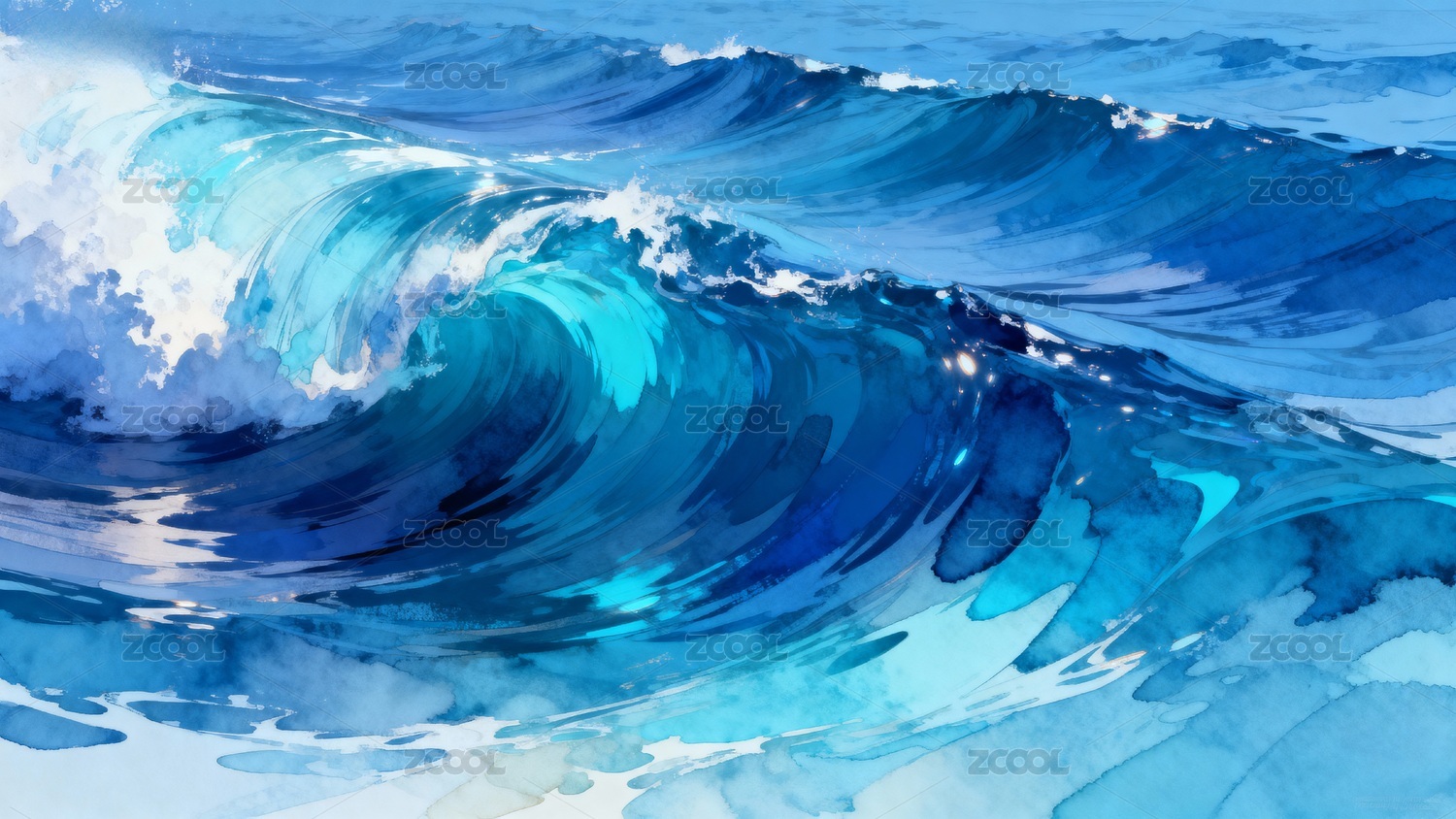 蓝色海浪水彩画