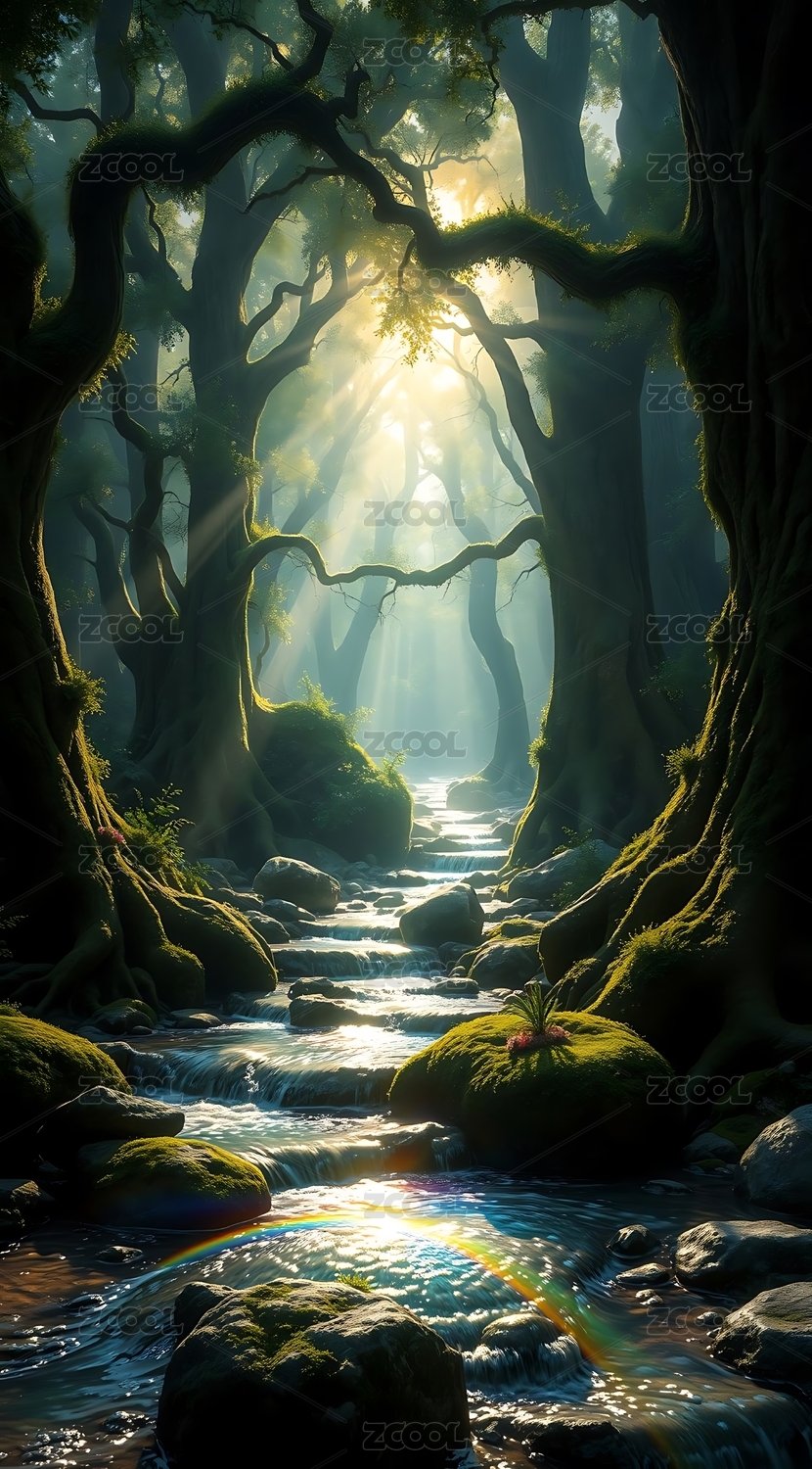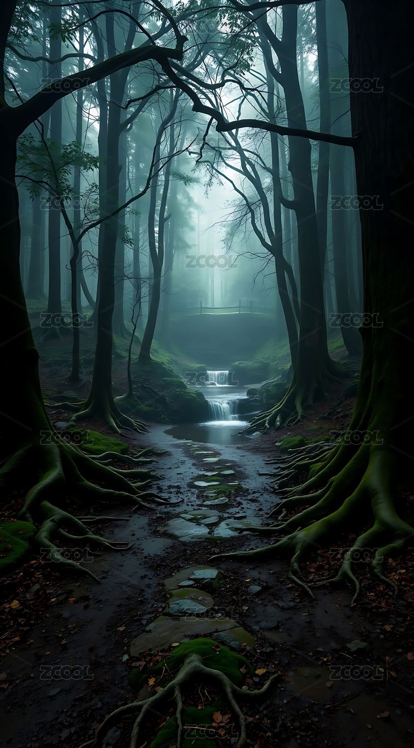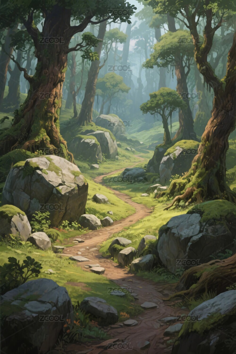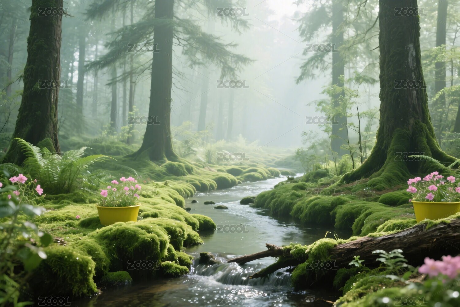 森林,溪流,小径,苔藓,云雾,树木,石头,自然,插画,景观
