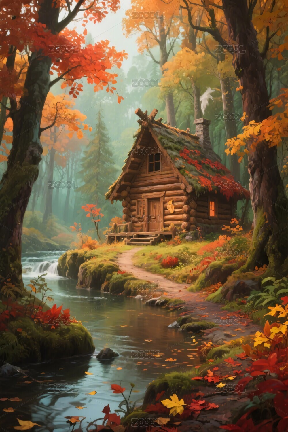 森林,木屋,溪流,秋景,秋色,落叶,道路,自然,插画,乡村