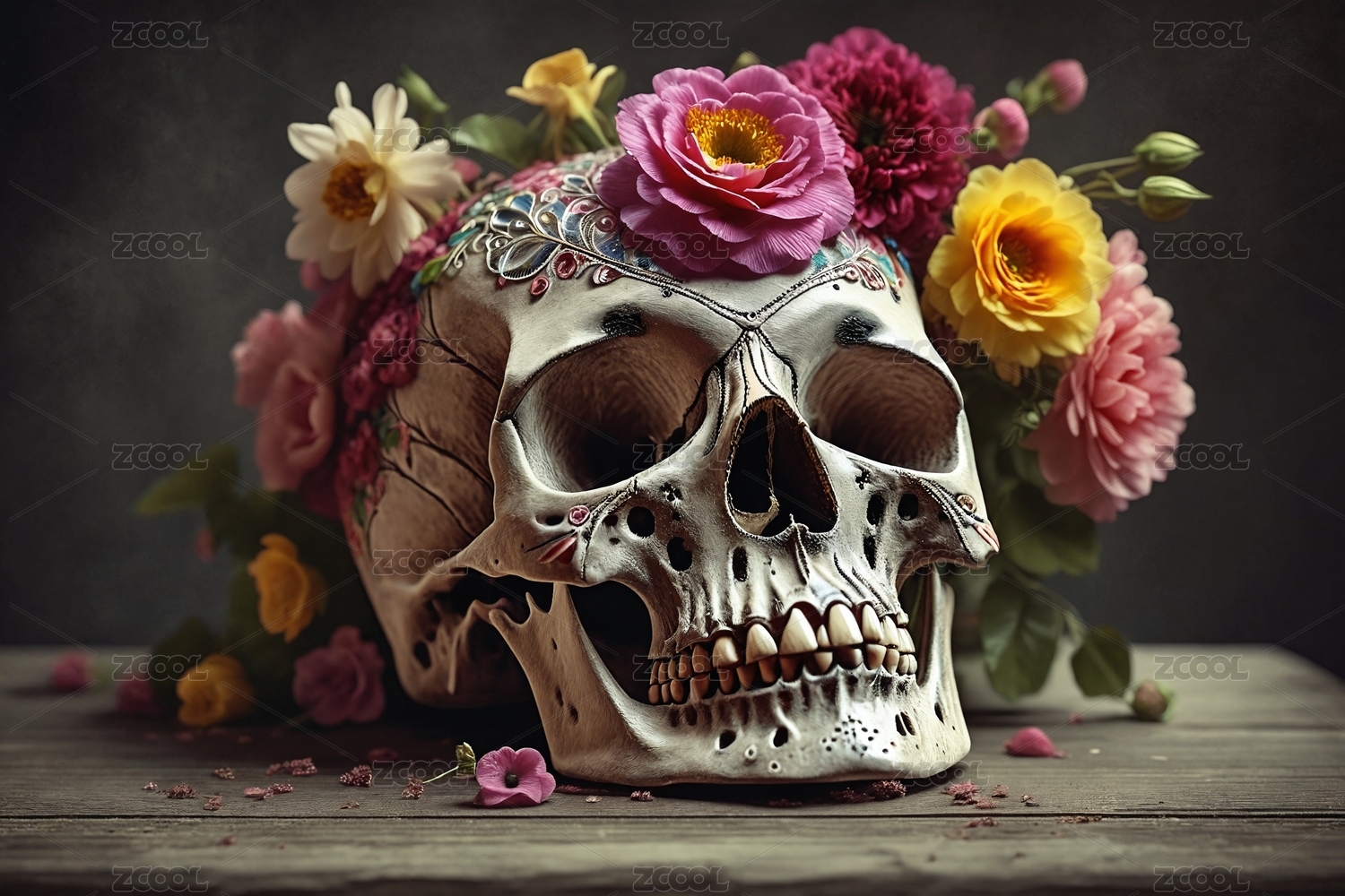 花卉装饰的彩绘骷髅
