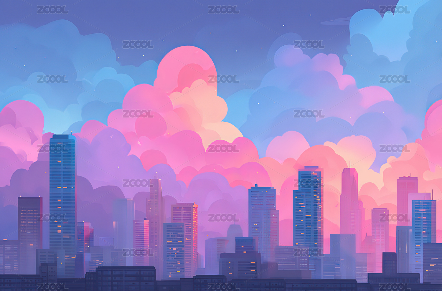 建筑,天空,云朵,色彩,蓝色,卡通,梦幻,插画,幻想,城市