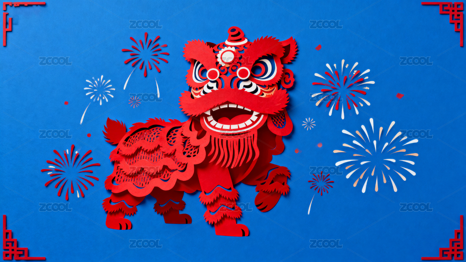 红色舞狮剪纸艺术配烟花