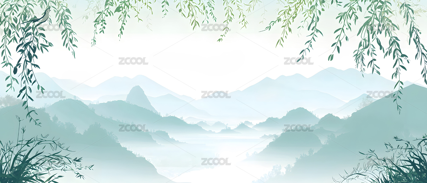 水墨山水与垂柳
