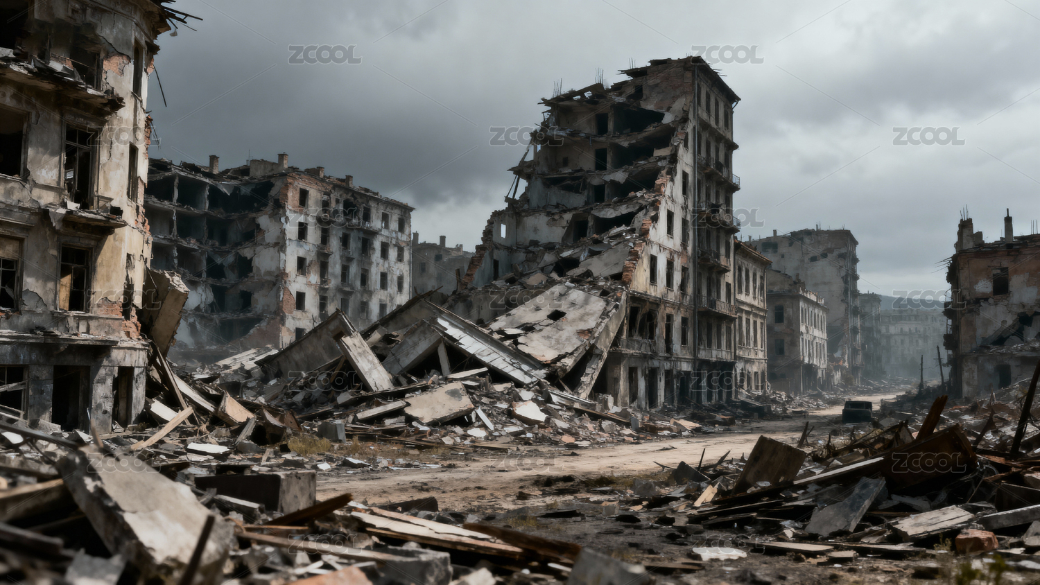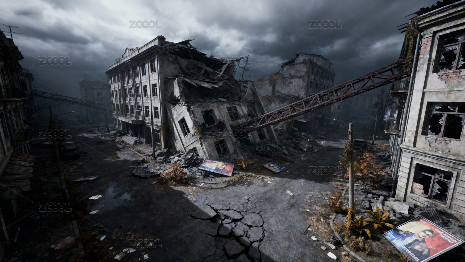 建筑,天空,废墟,残破,瓦砾,乌云,街道,破损,窗户,铁架