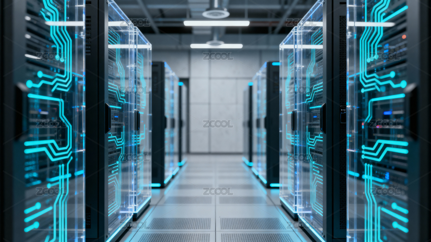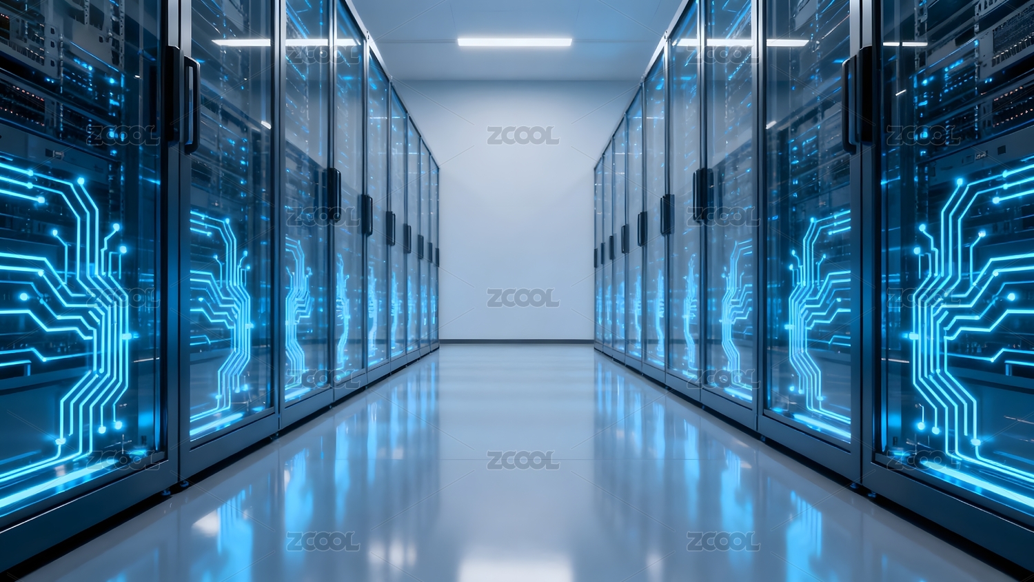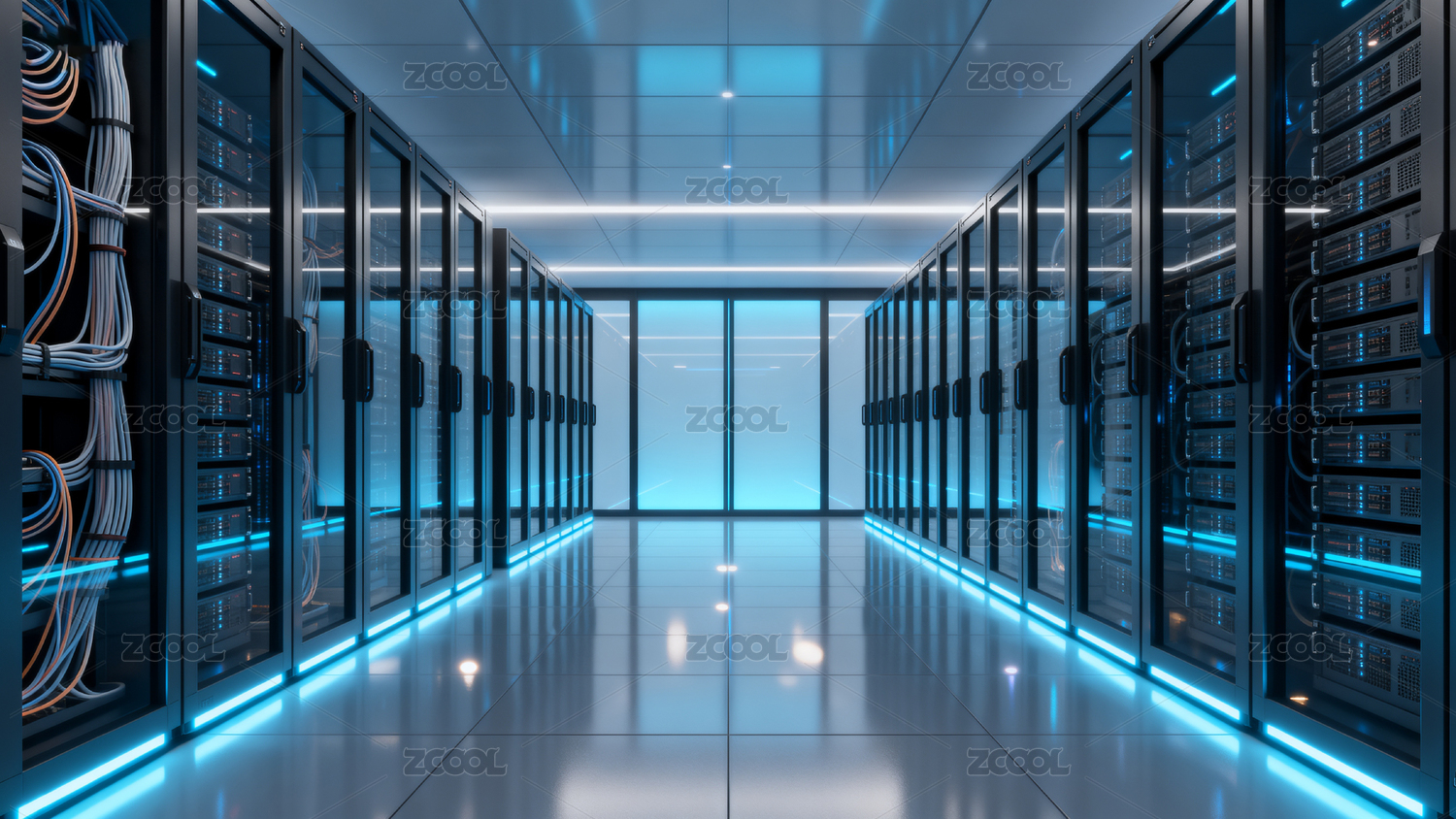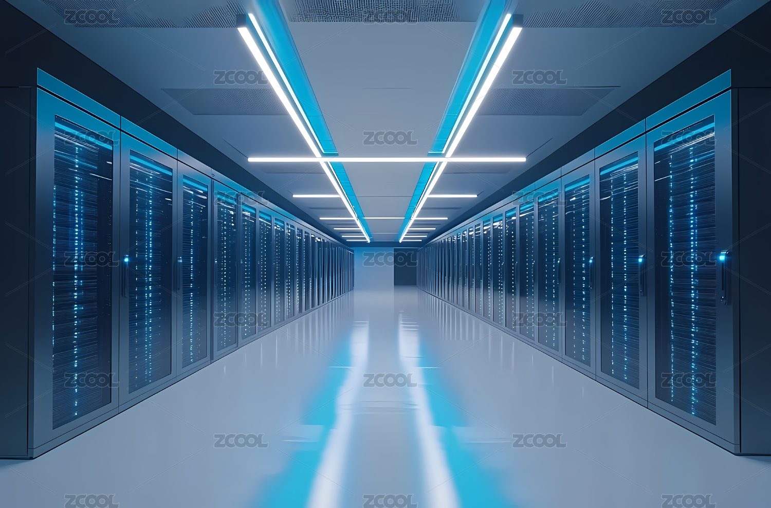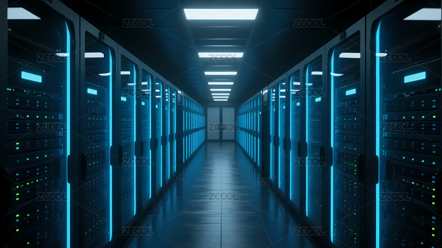 三维渲染的现代化高科技的服务器机房,强大的数据库和运算存储能力。