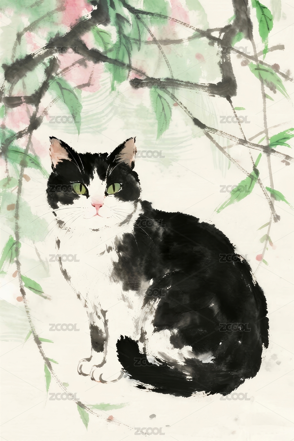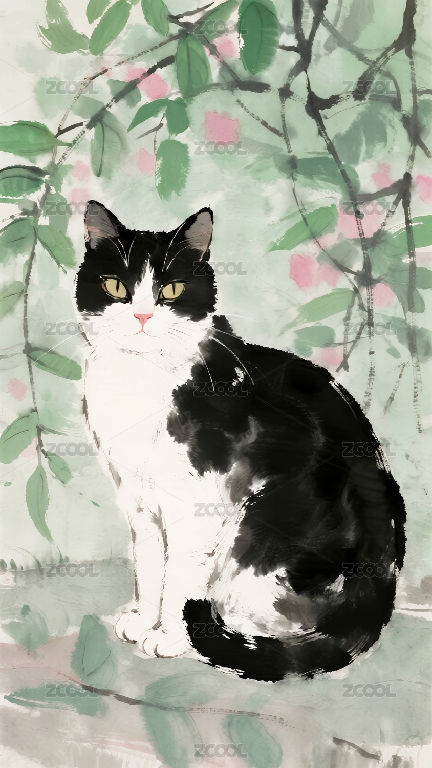 花猫水墨风花枝场景
