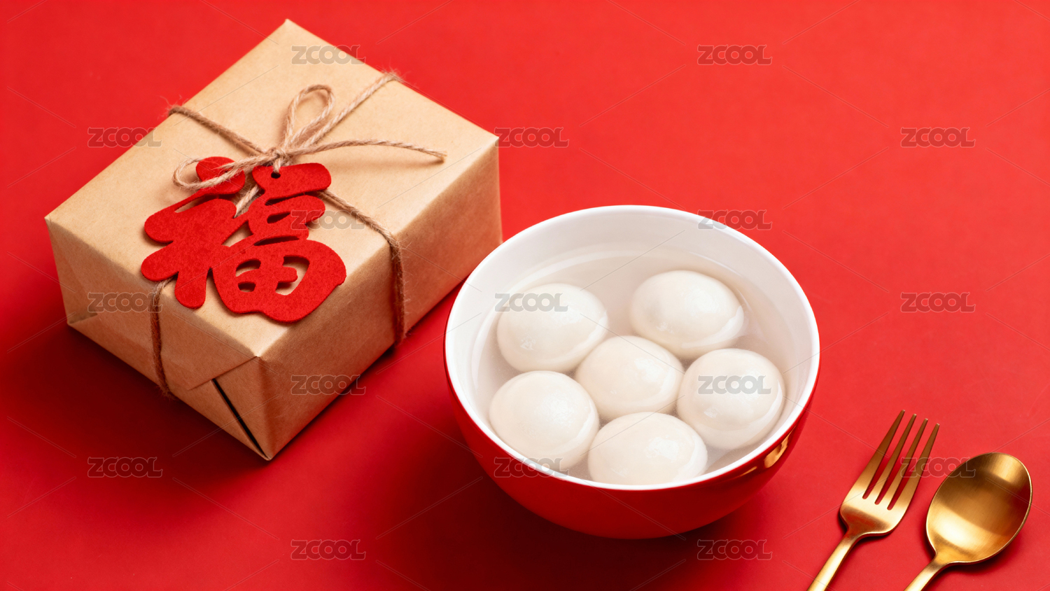煮熟的元宵节汤圆在毛笔手写春联背景上
