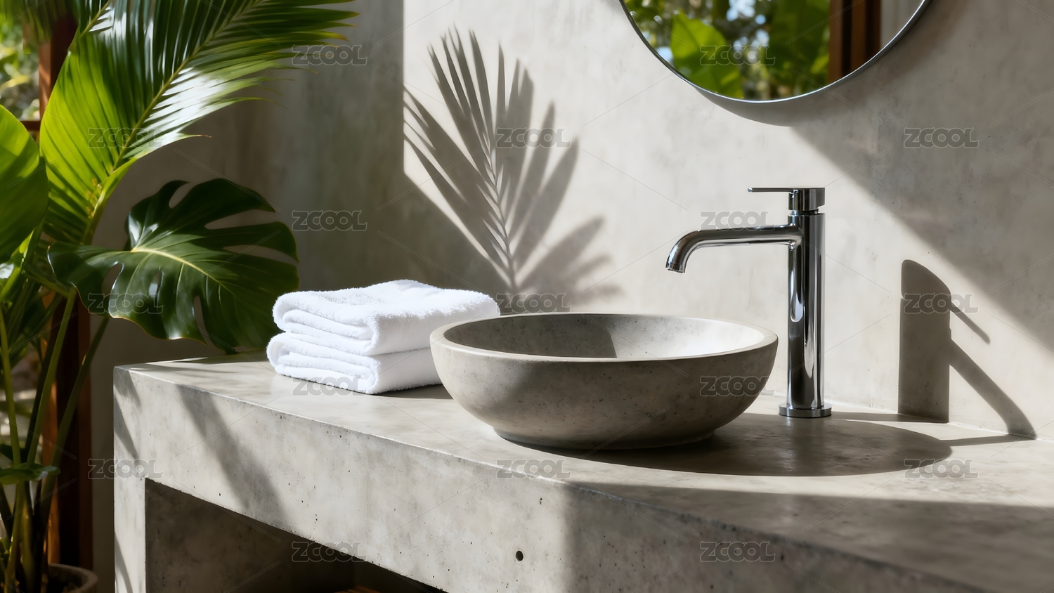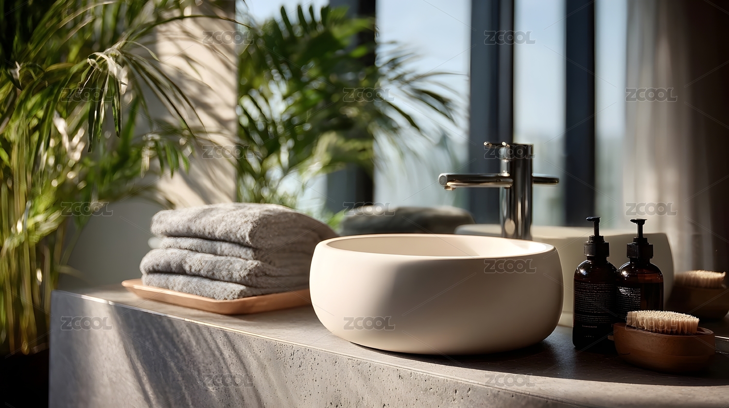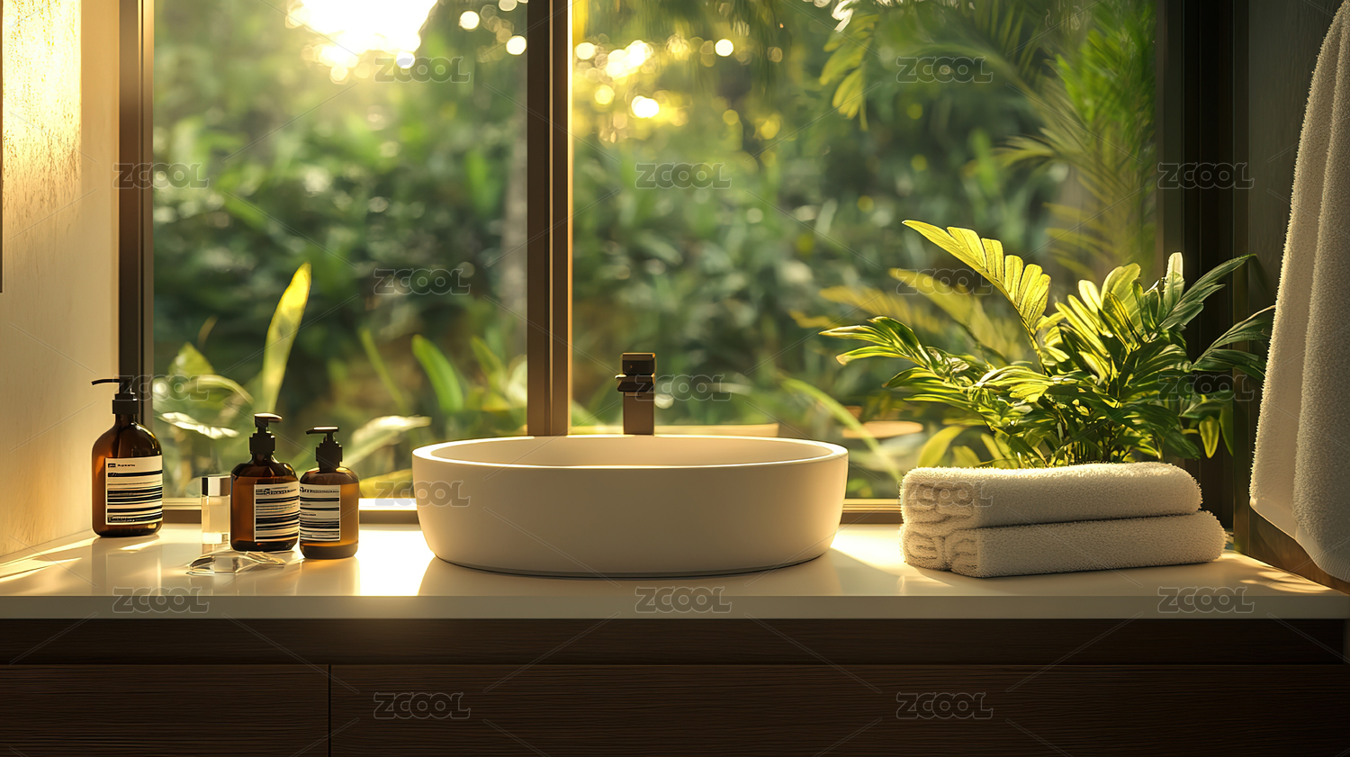 明亮浴室窗边绿植与洗手台
