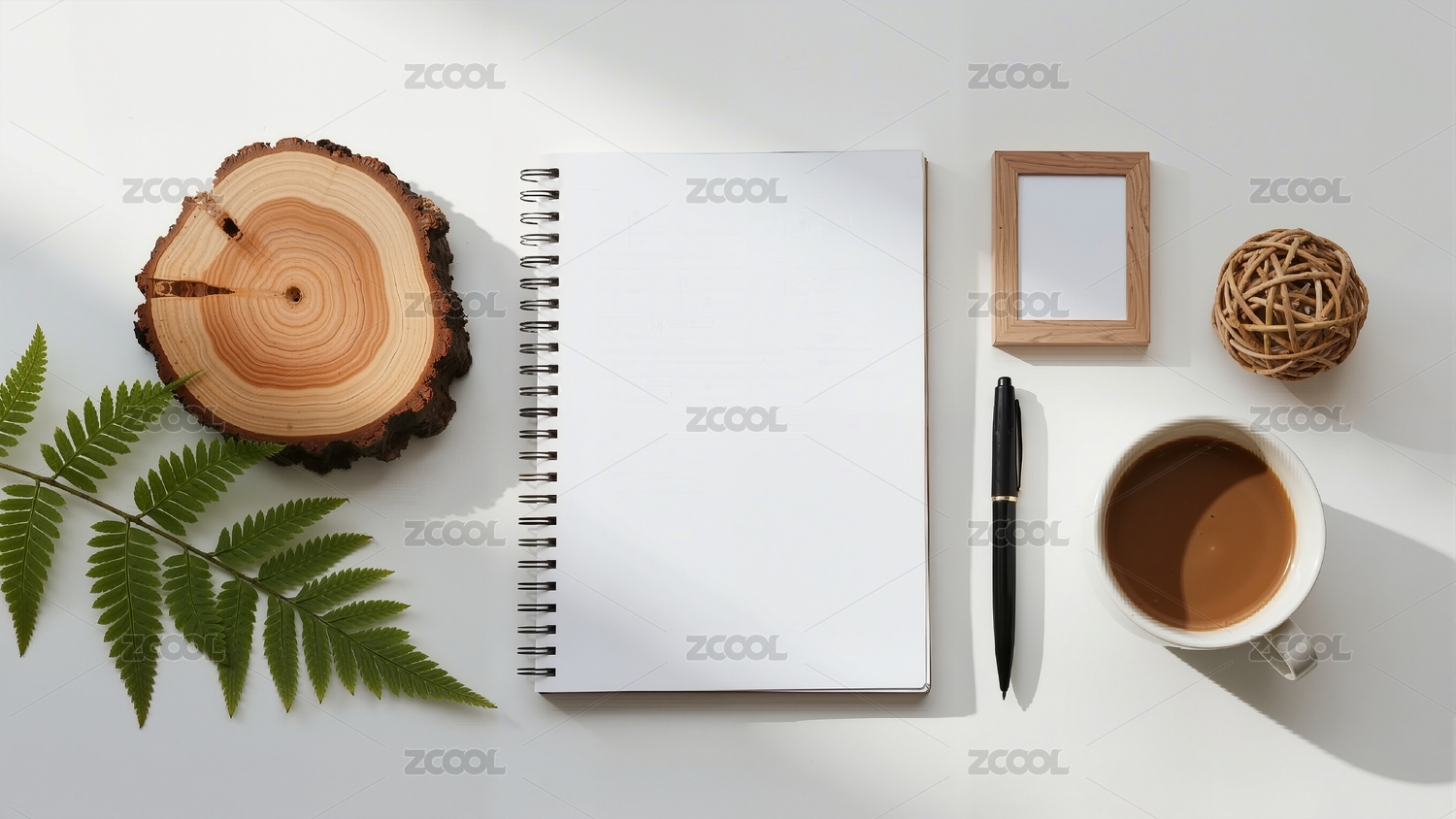 正上方是一张白色背景的笔记本电脑和咖啡杯