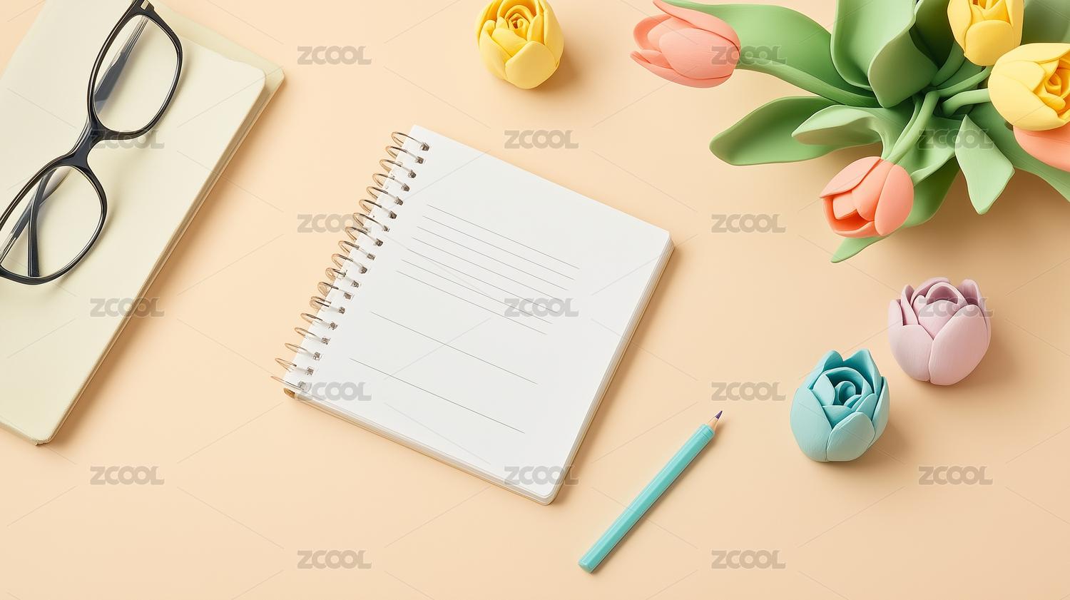 笔记本、笔、咖啡杯、书本、台历、眼镜、智能手表放在复古木质桌面上