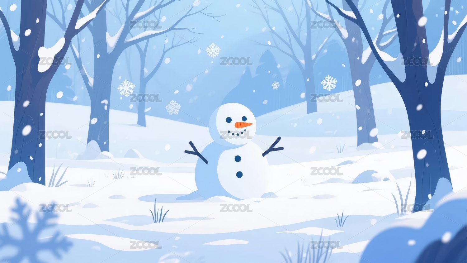 寒冷冬季阳光下的雪人3D立体卡通插画