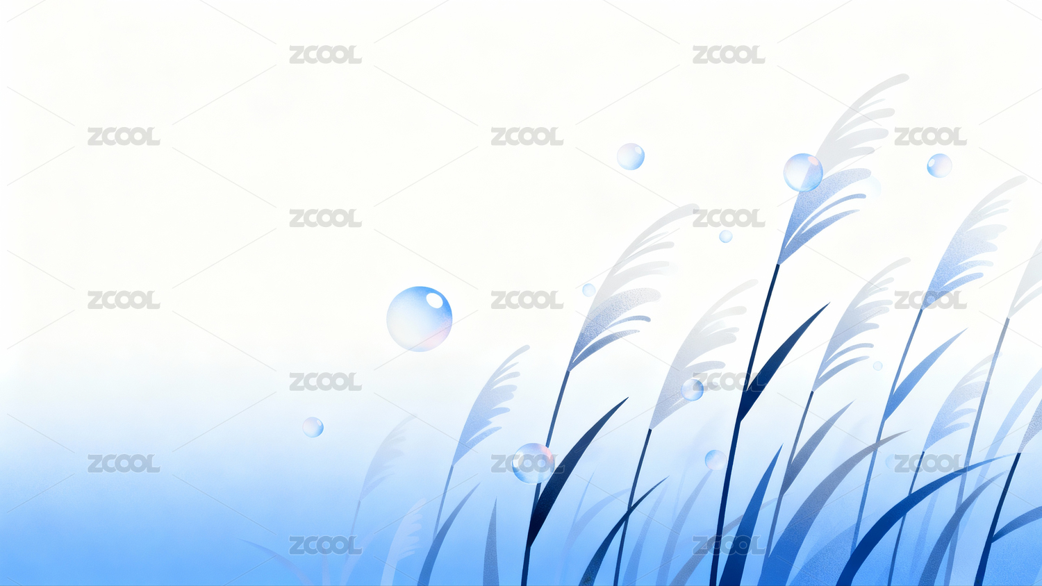 霜花落在草上,草丛上面是蓝天白云,蓝色唯美卡通小清新朦胧的节气插画