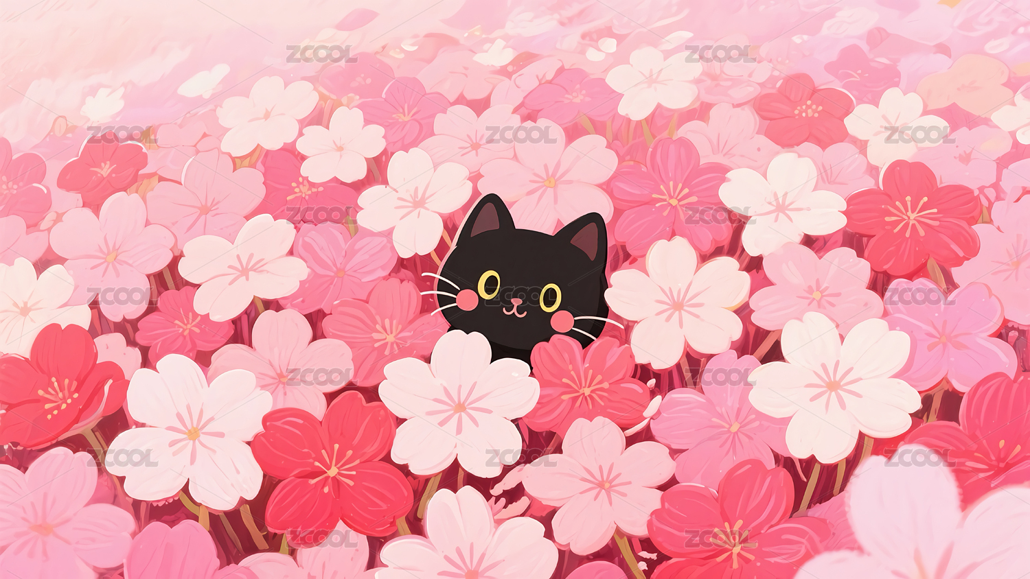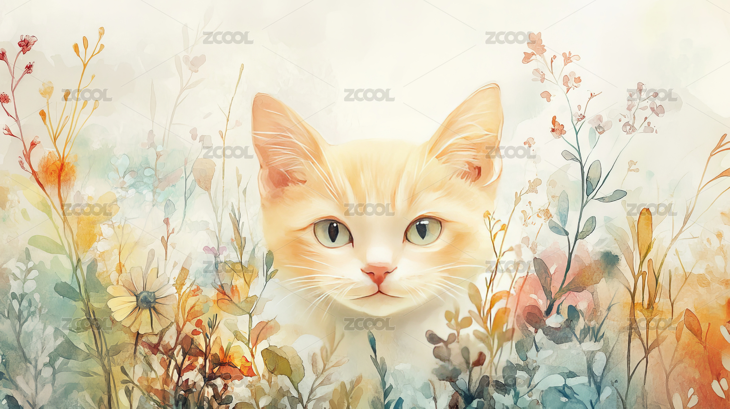 儿童插画一只小猫在五颜六色的花丛中