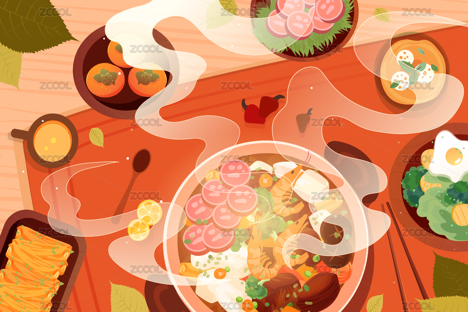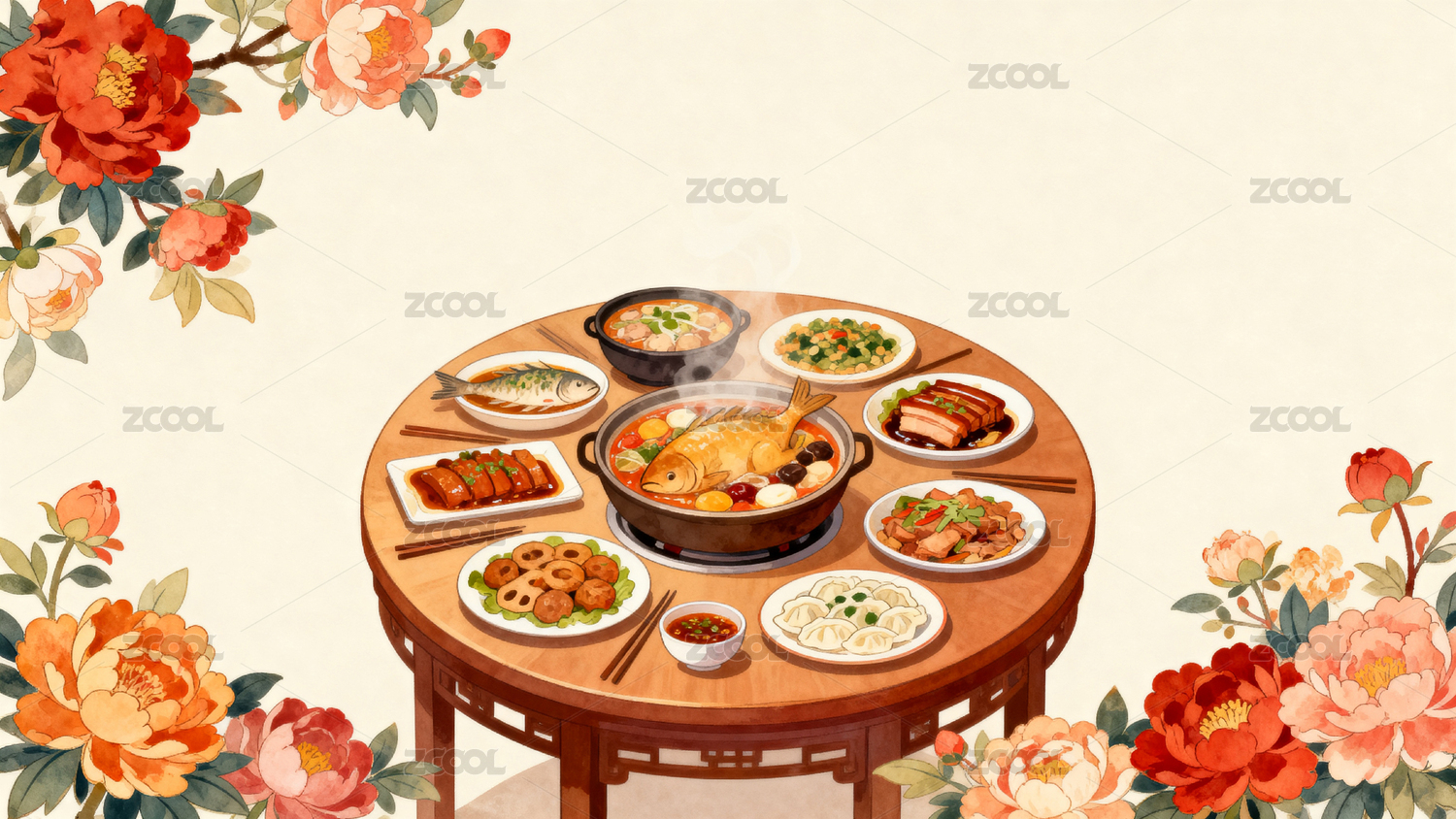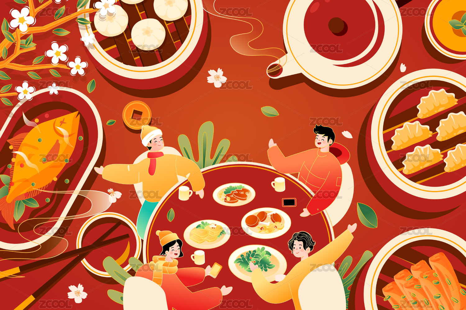 一桌丰盛的中国菜传统晚宴的中国风喜庆插画