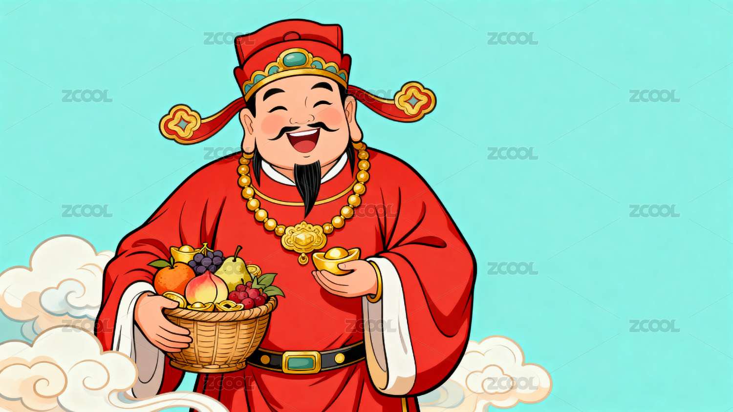 财神爷手持元宝与水果