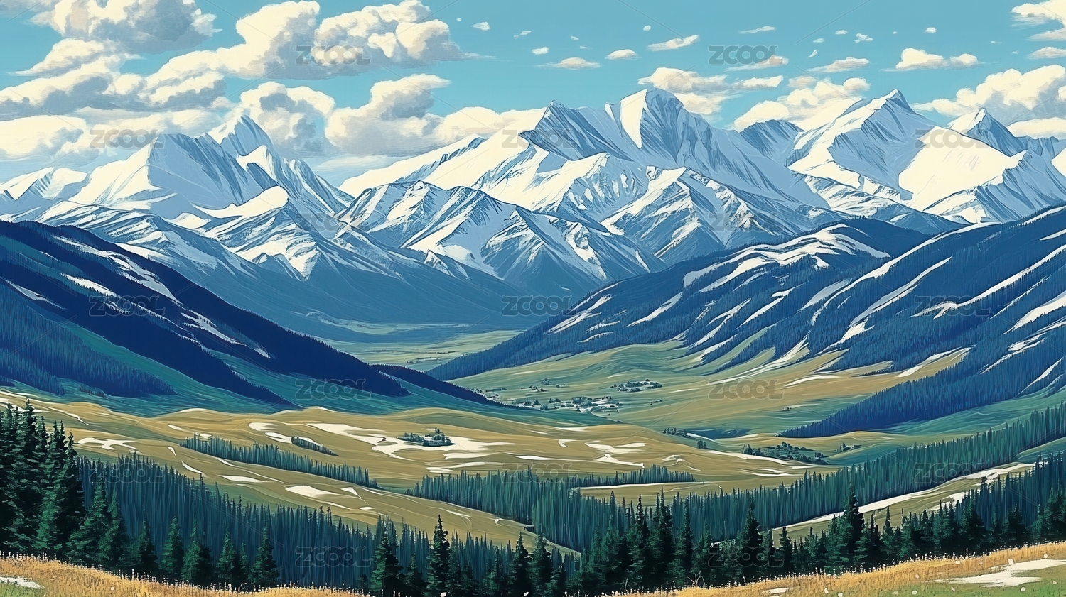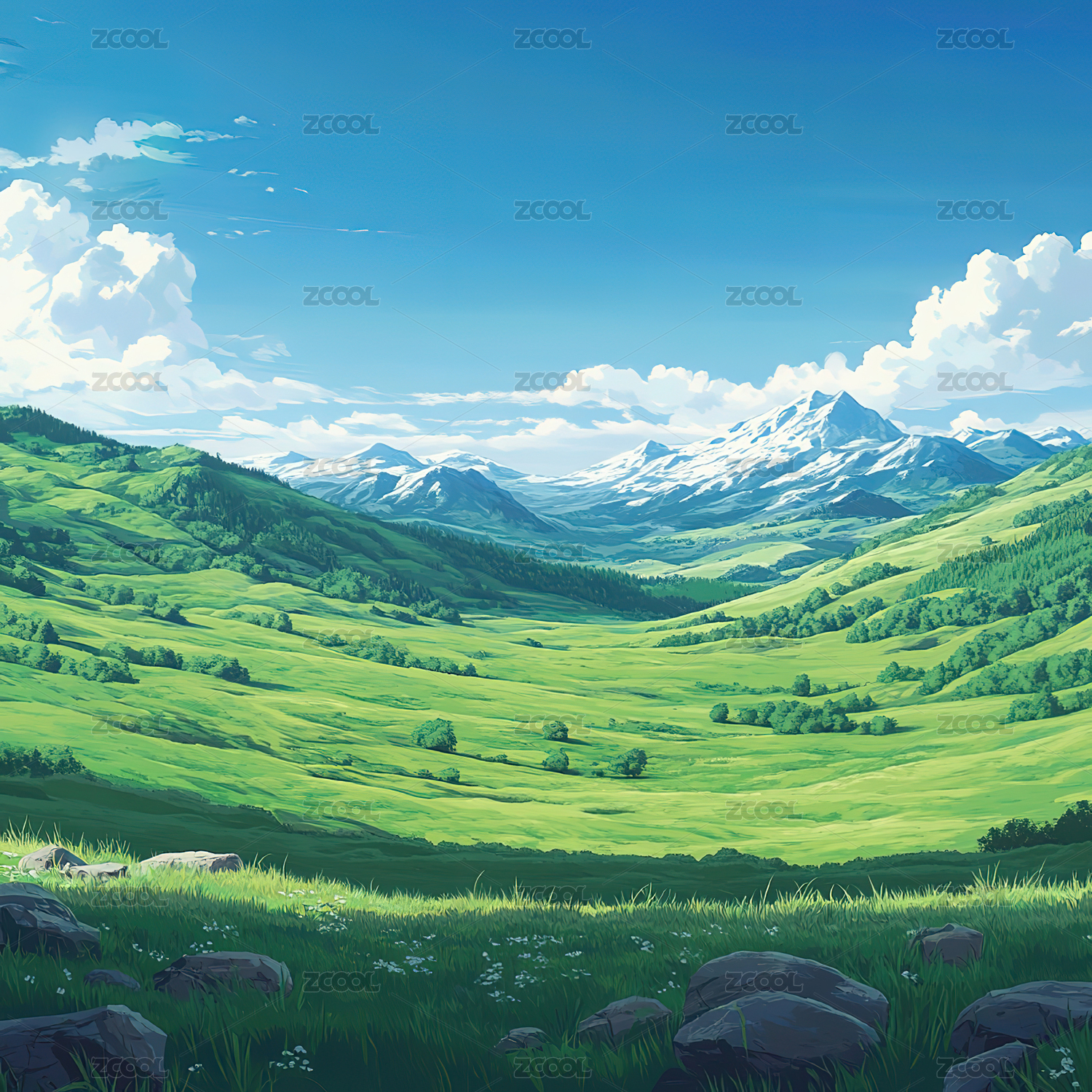 清新明亮绿色辽阔草原起伏的雪山插画绘画