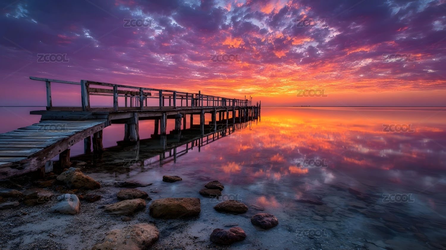 日出栈桥天空倒影