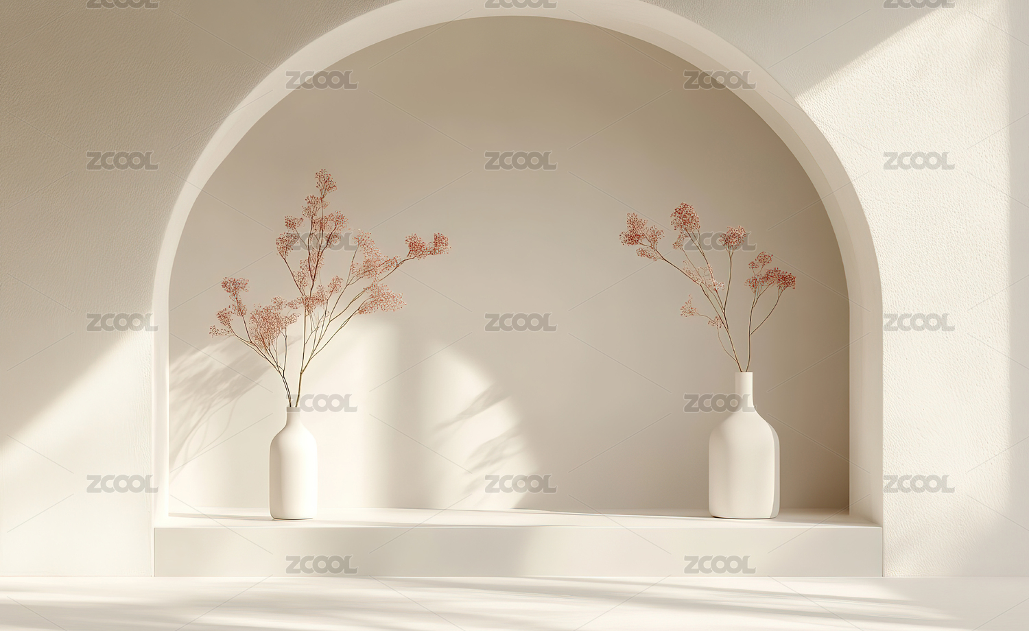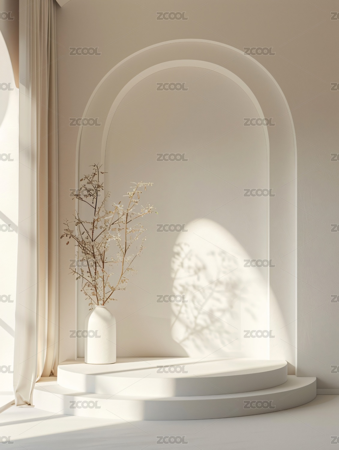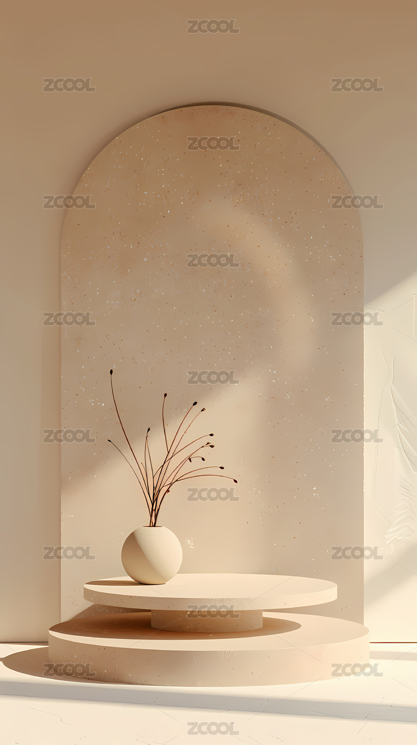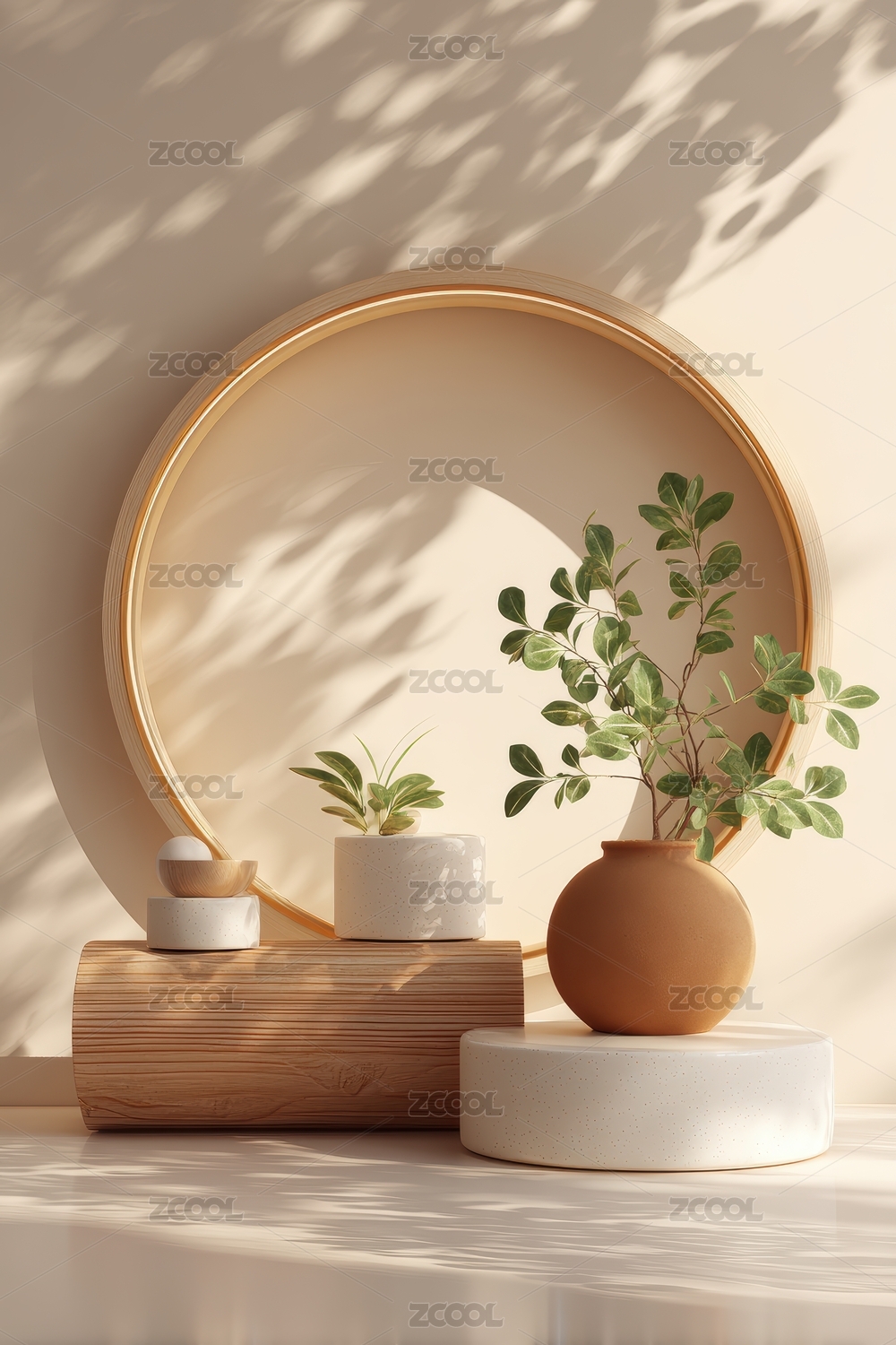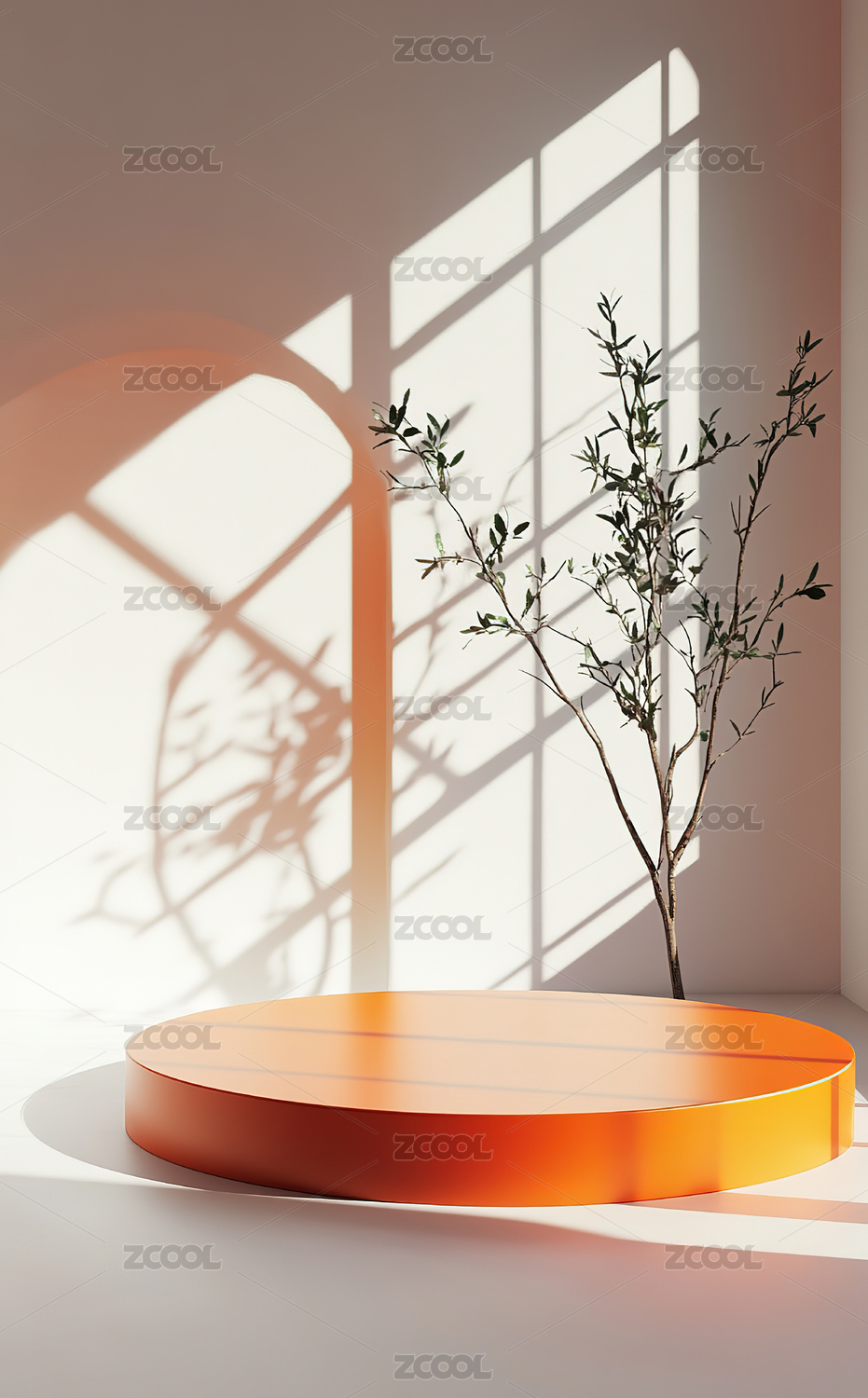 橙色房间内圆窗前盆栽树木装饰秋日氛围