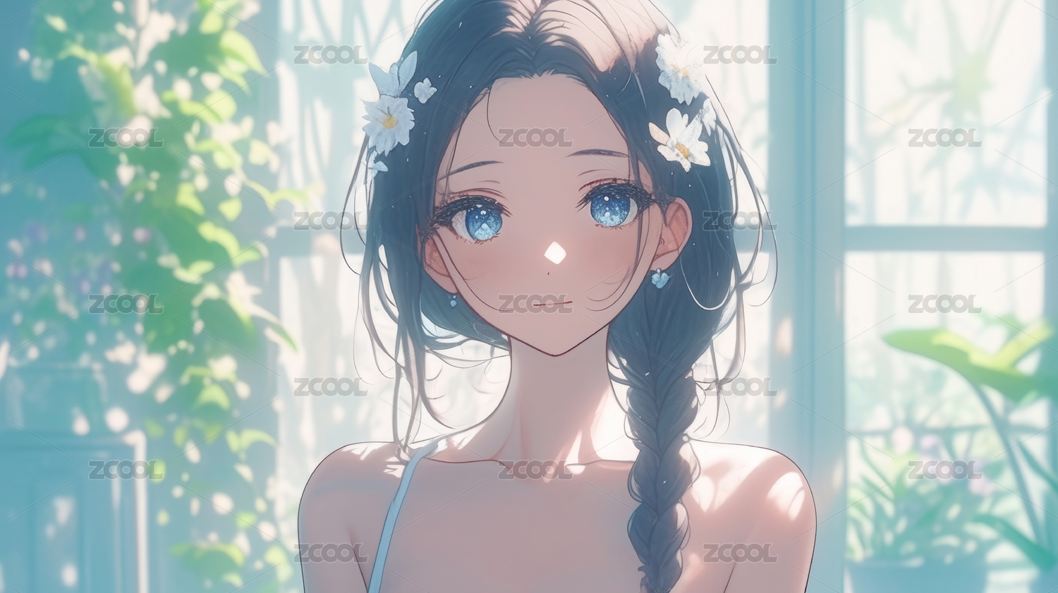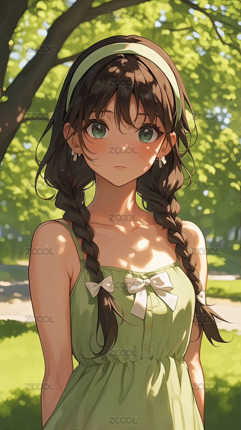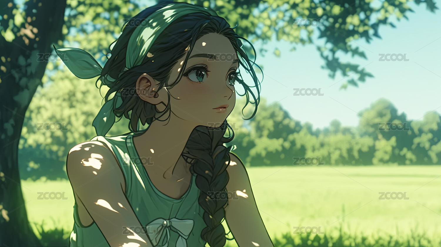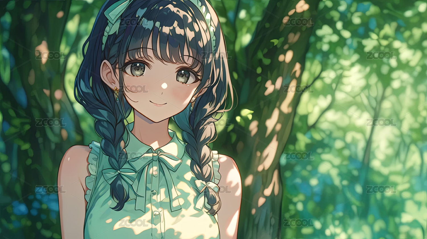 绿衣,少女,树下,微笑,春日,温柔,气质,黑发,发带,背景