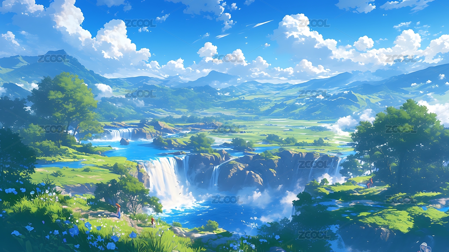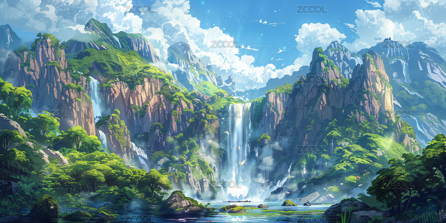 绿色,山谷,瀑布,群落,环绕,壮丽,自然,奇观,山峰,云雾