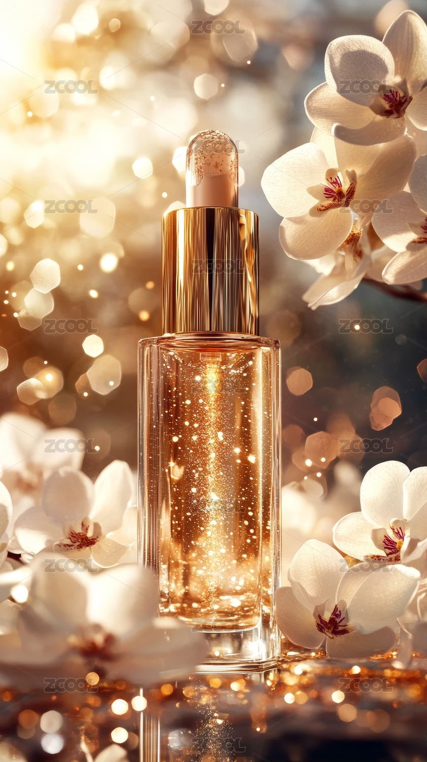 金色,精华液,瓶子,白兰花,环绕,奢华,护肤,美感,玻璃,液体