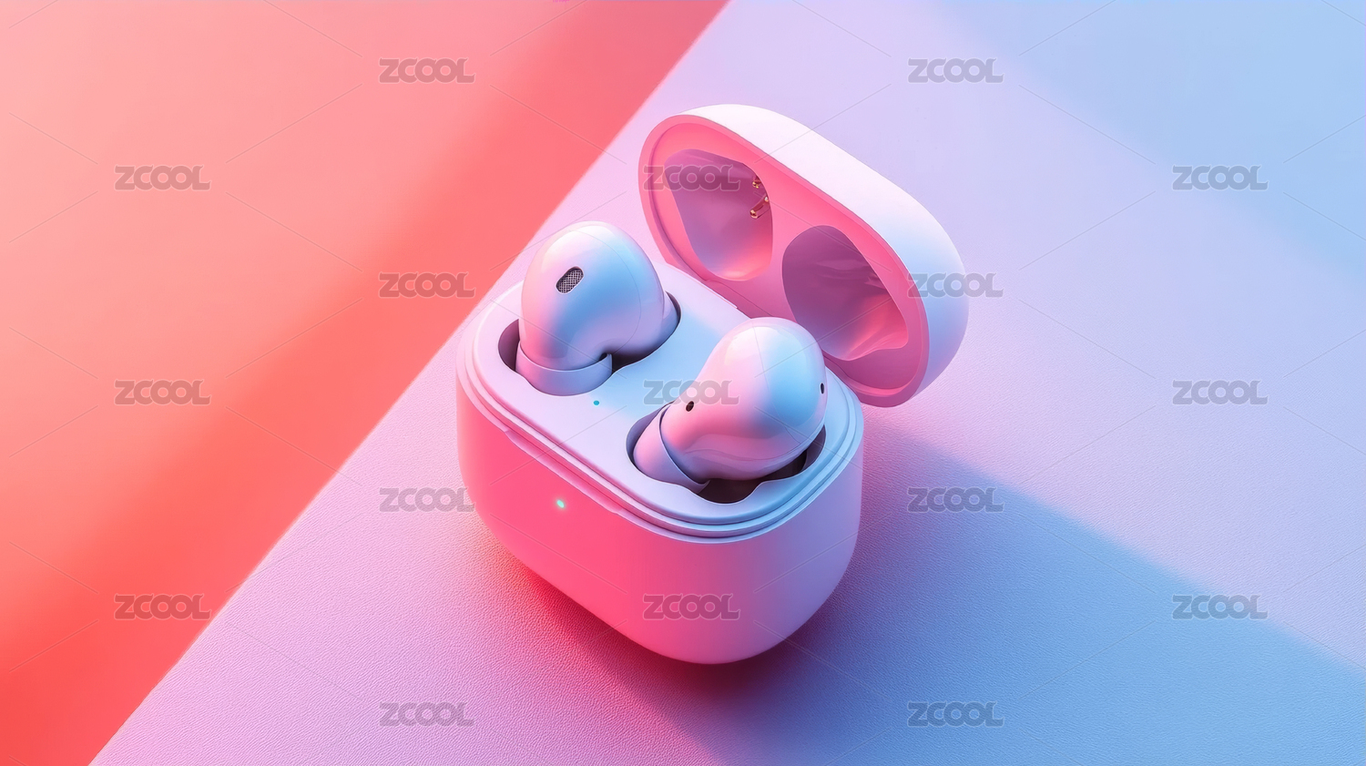 白色无线耳机置于蓝色粉色背景
