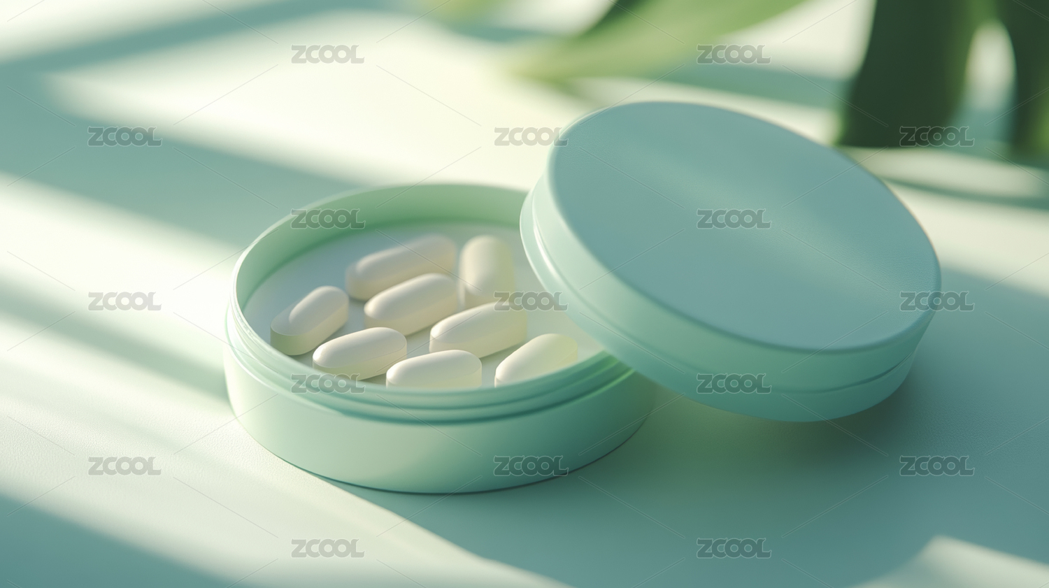 浅绿色药盒打开散落白色药丸