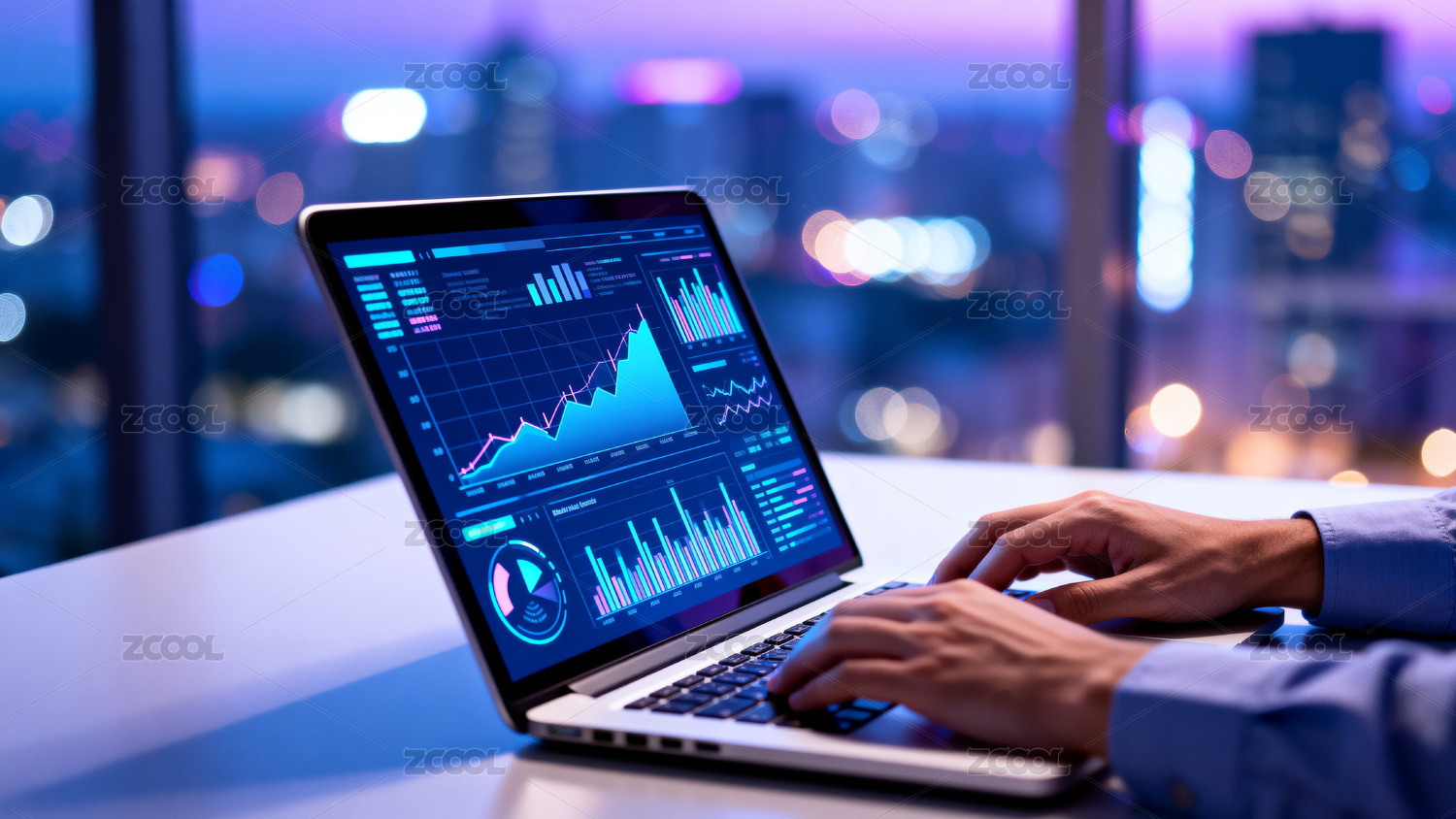 电脑屏幕数据图表与城市夜景