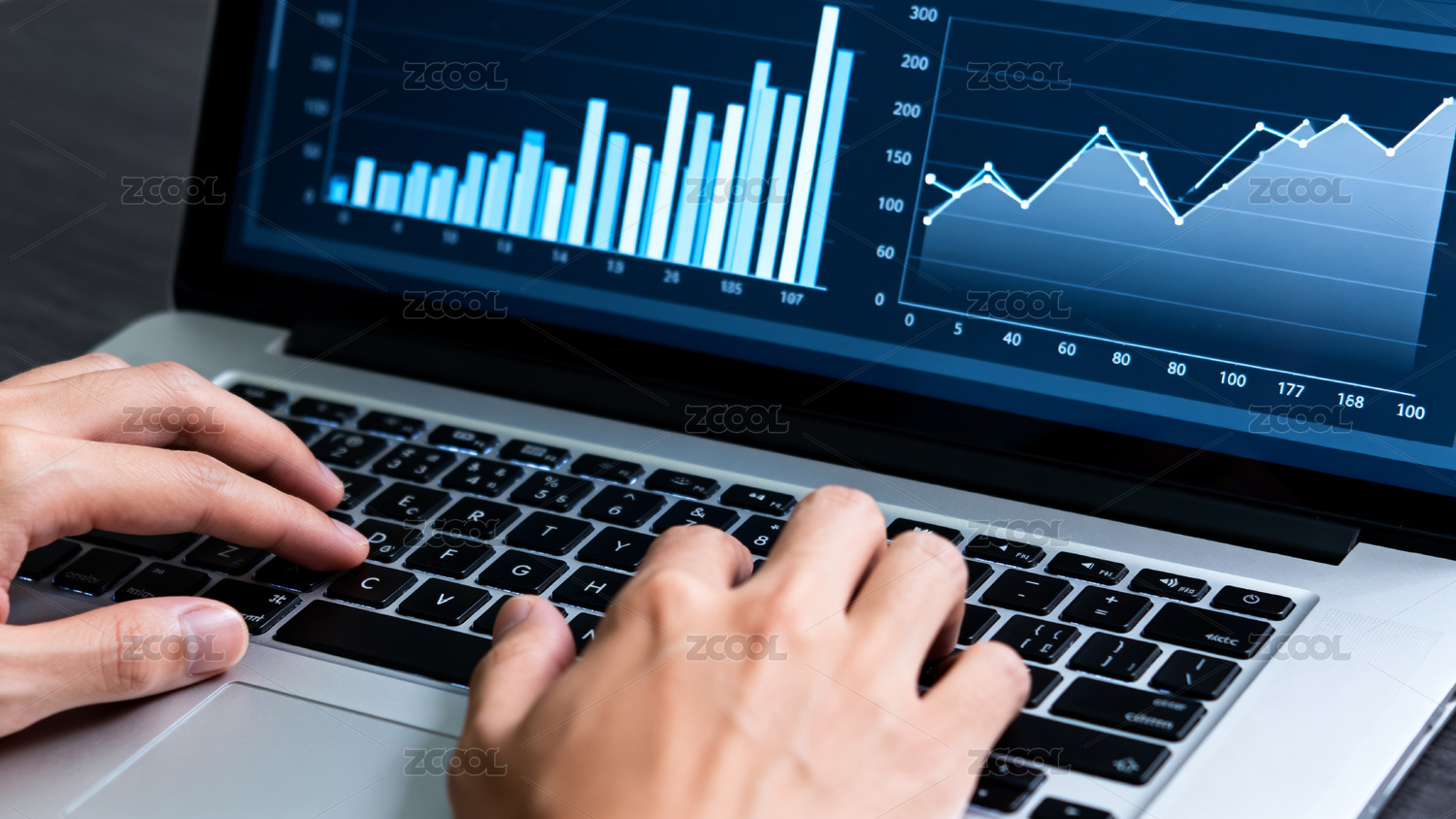 电脑屏幕显示数据图表双手操作键盘