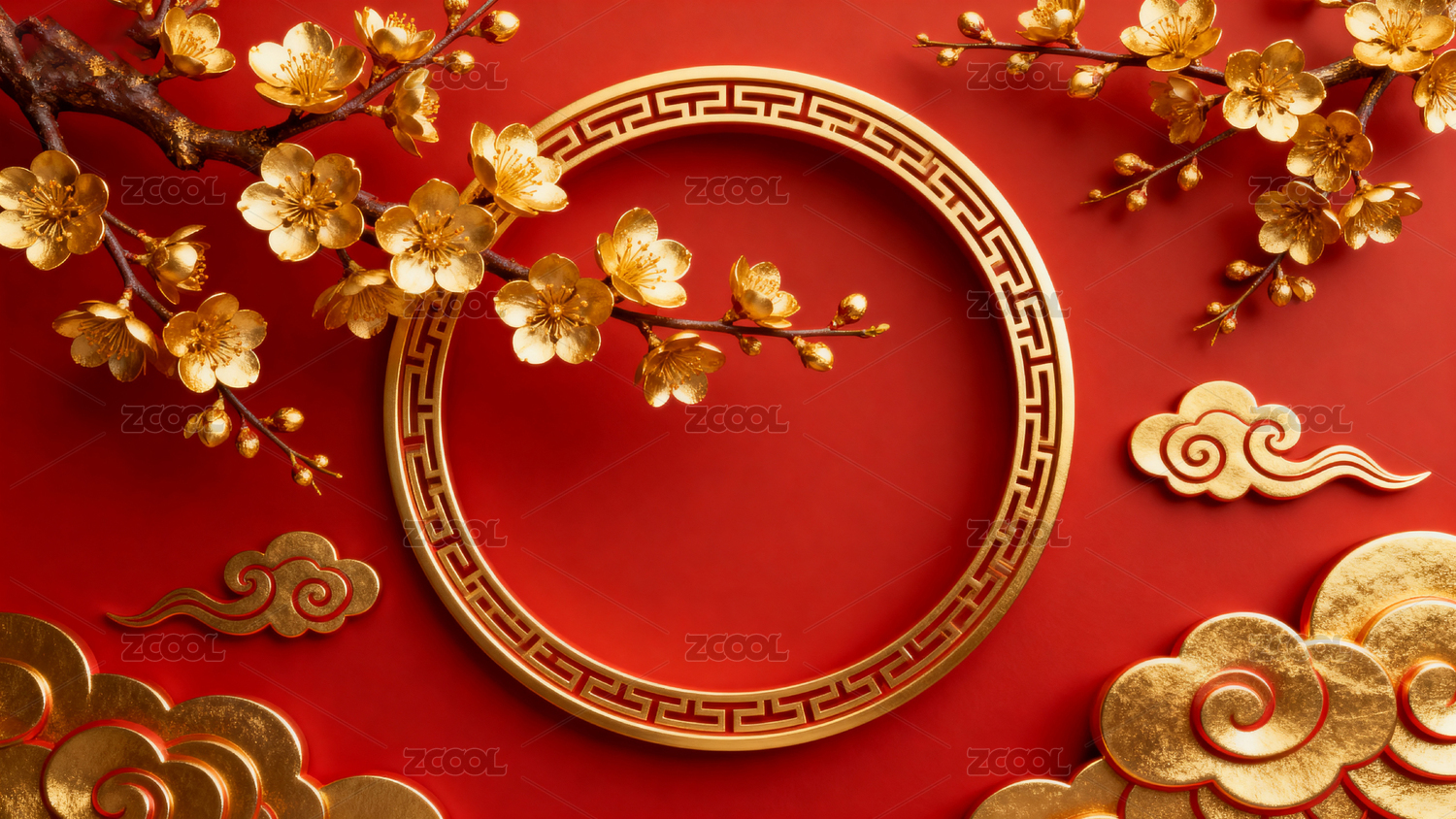 新年红色花卉背景,金色圆框点缀