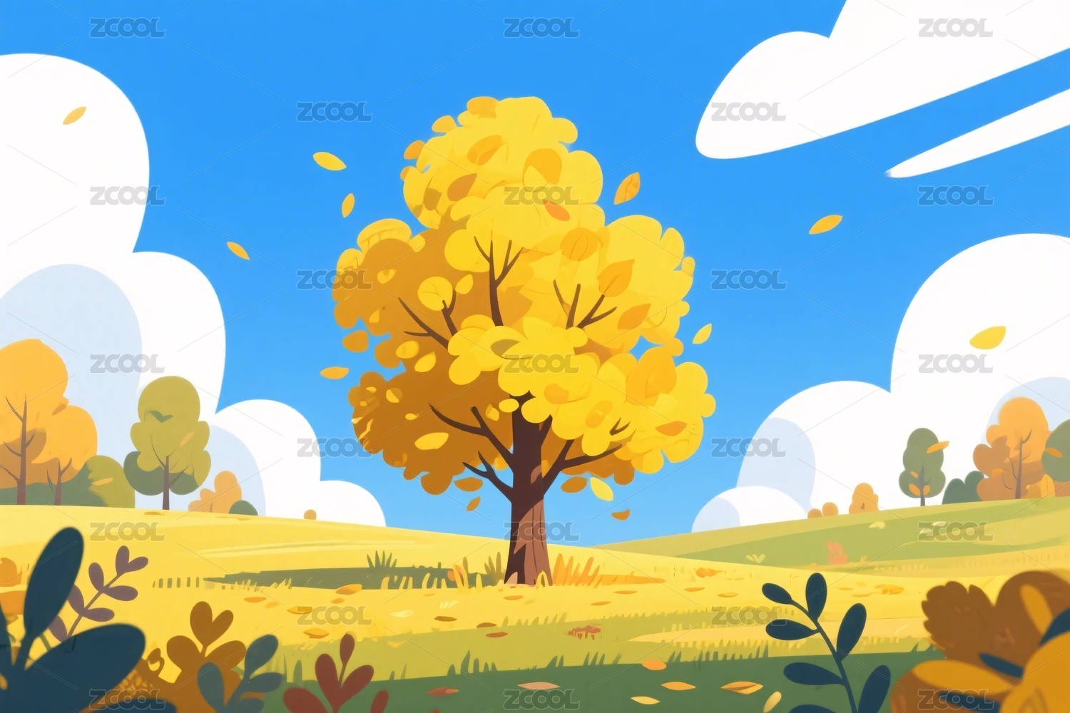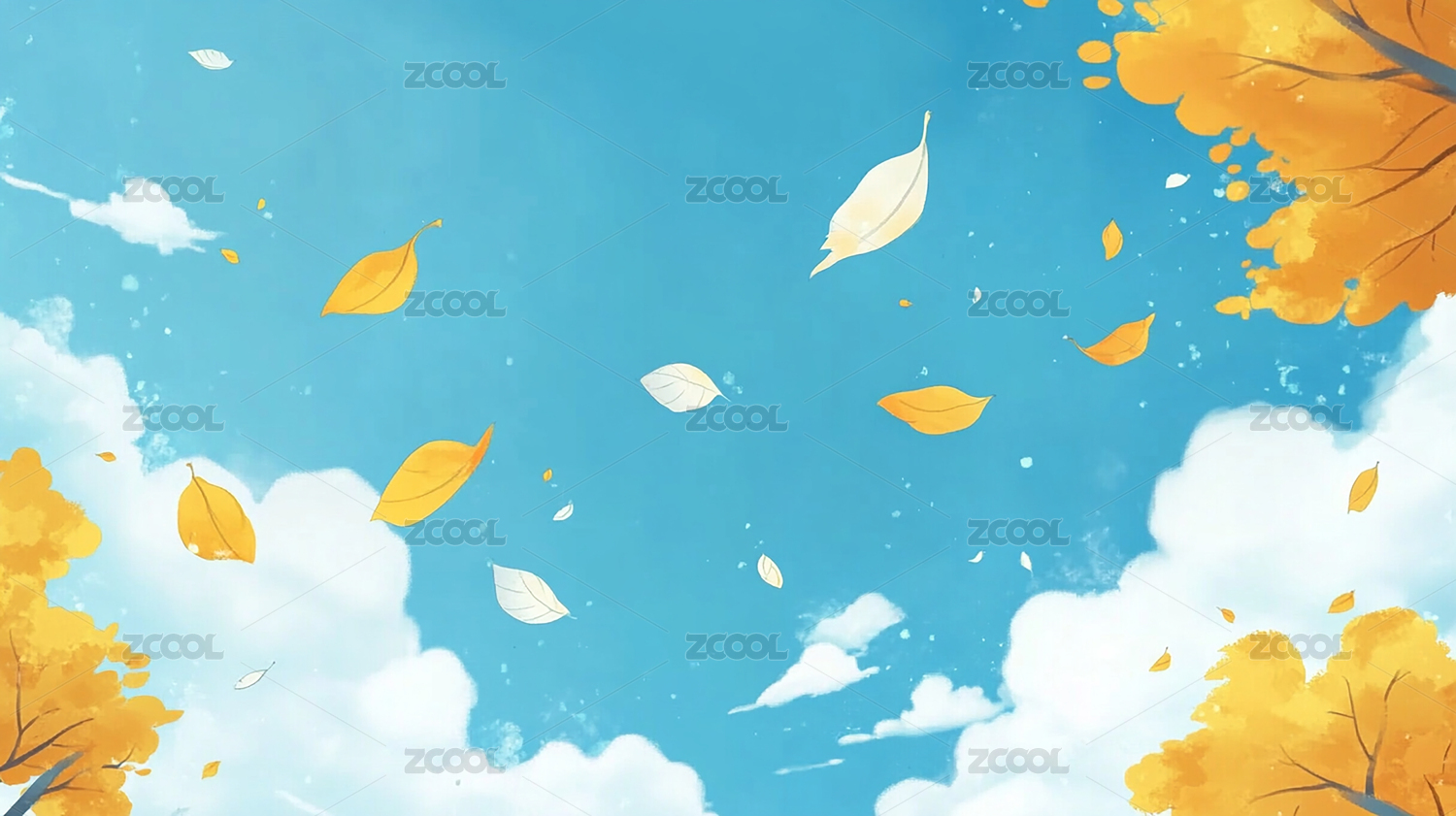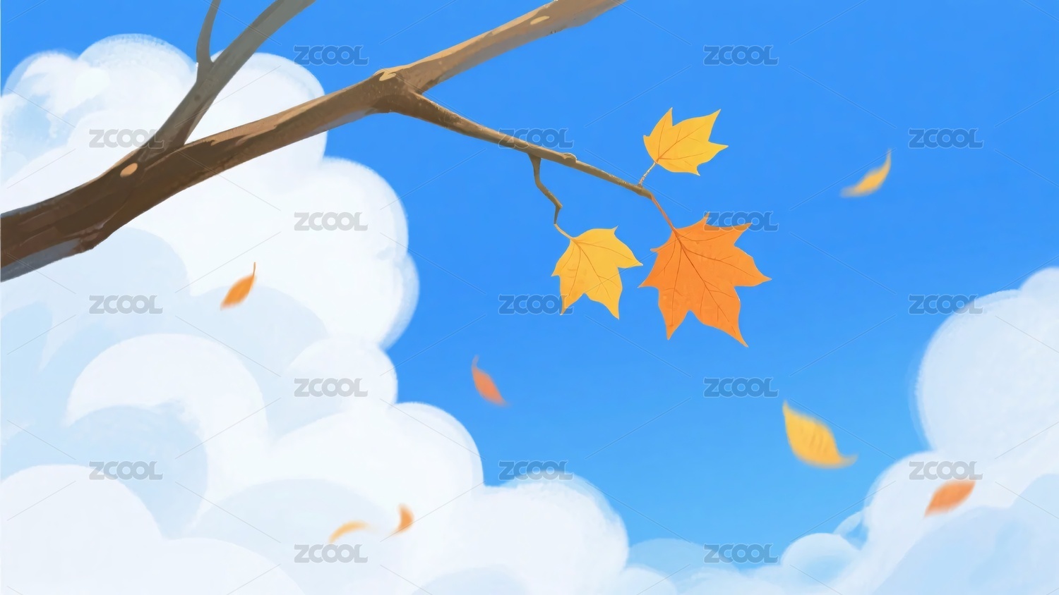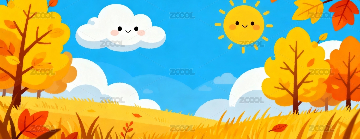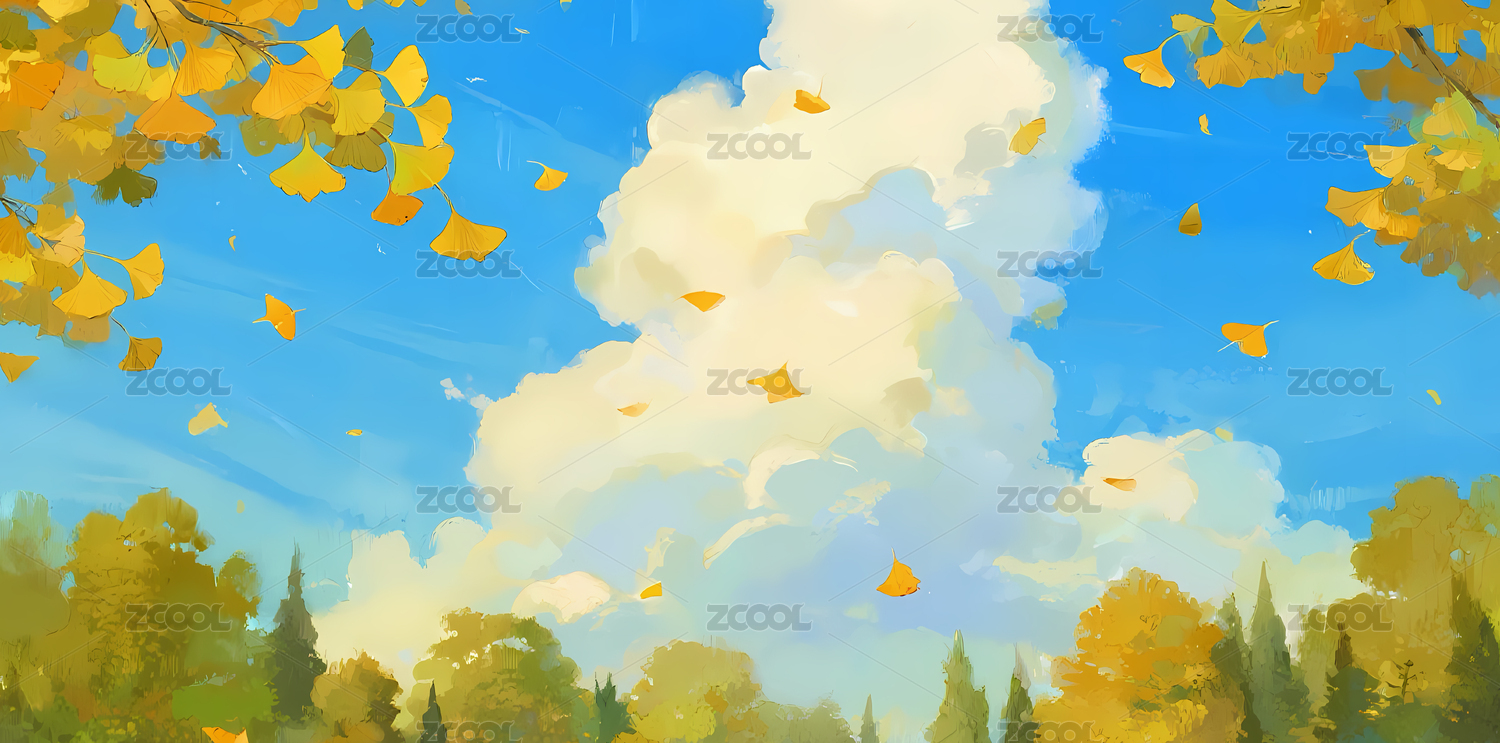 主视觉,商业,壁纸,卡通,云朵,秋日,风景,蓝天,太阳,黄叶