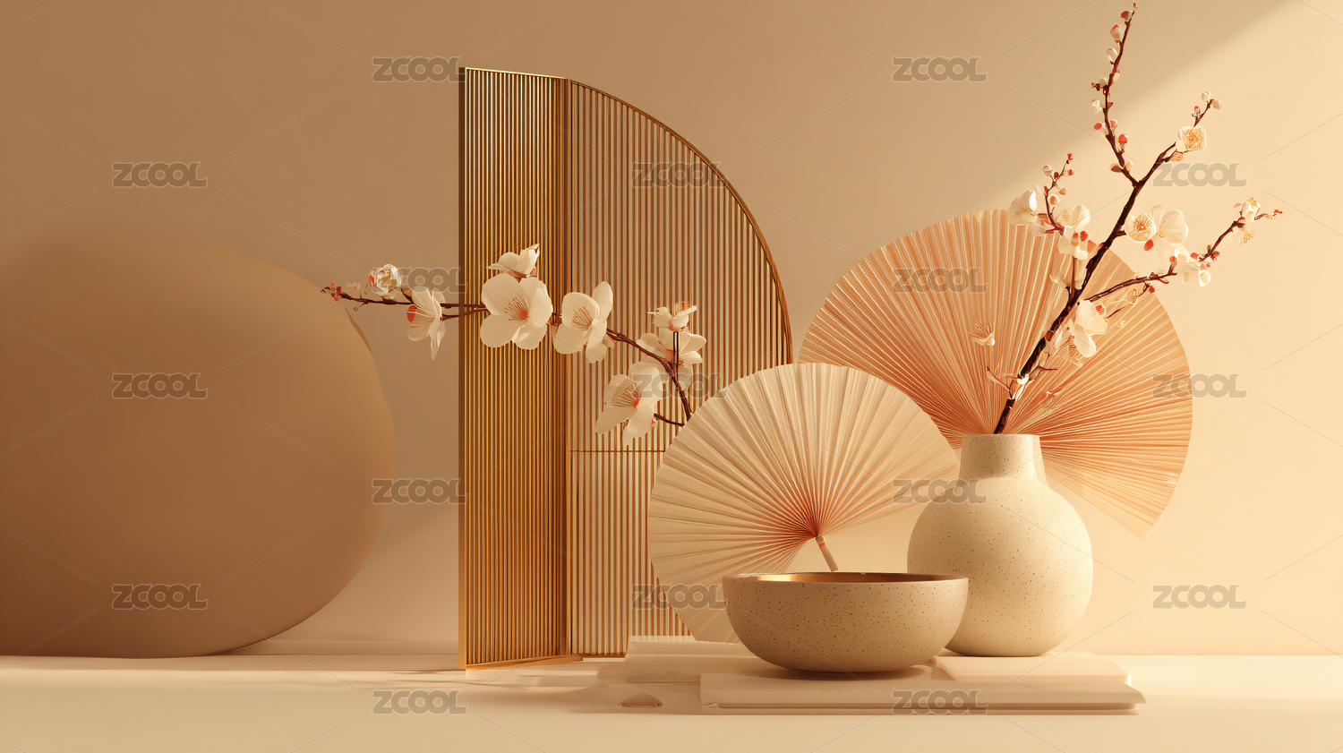 静物,暖调,折扇,花瓶,花枝,金碗,简约,雅致,温馨,家居