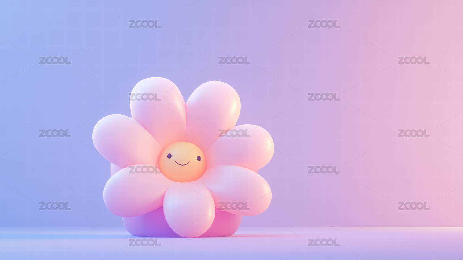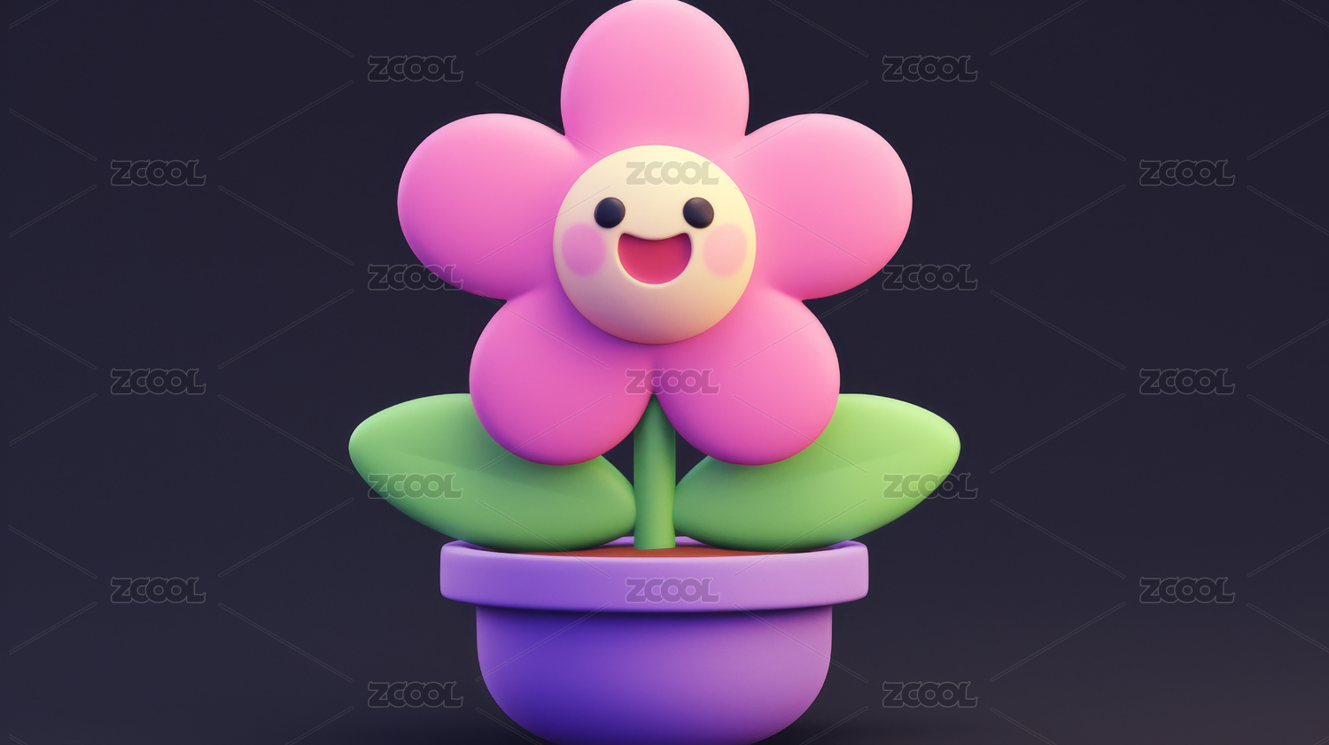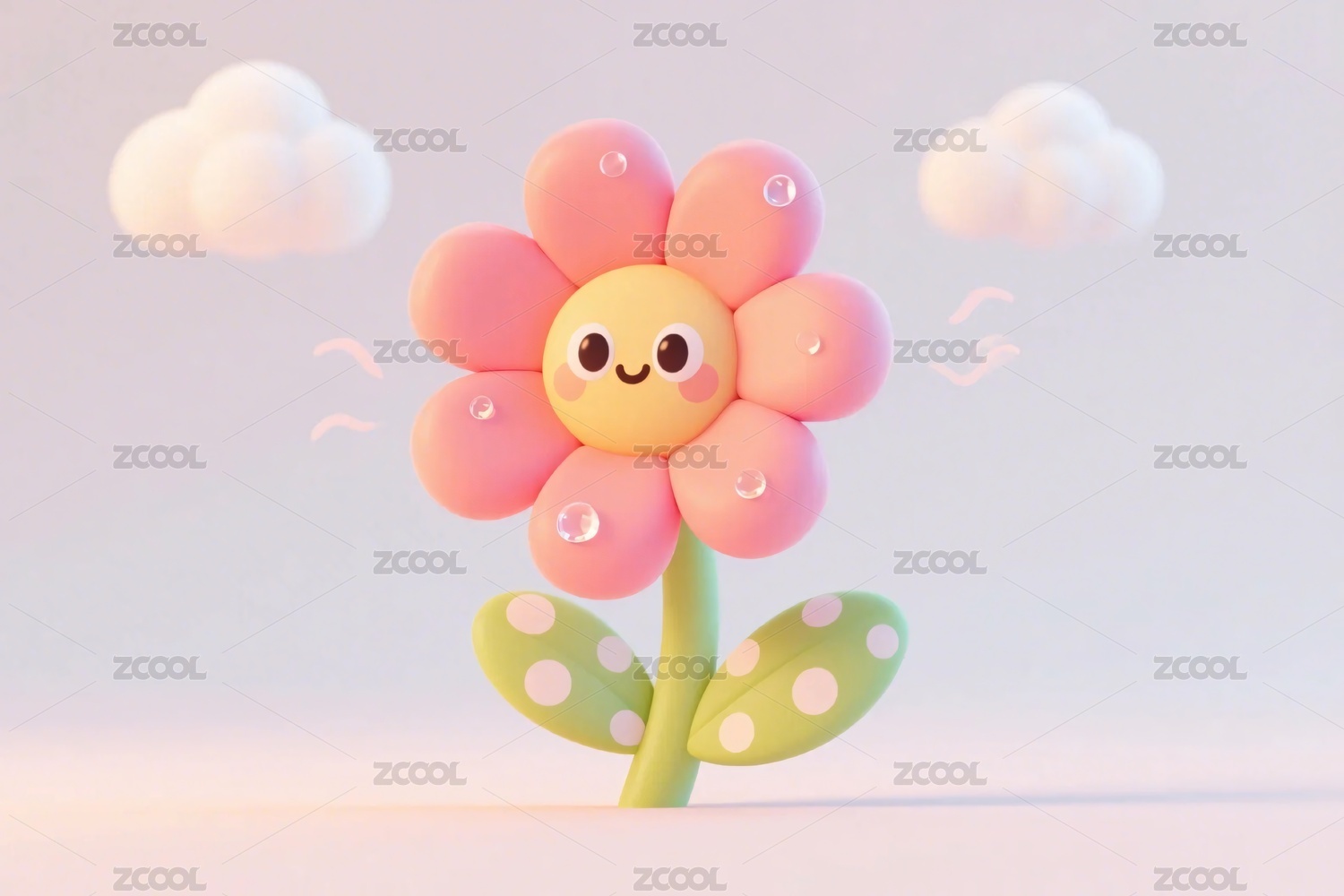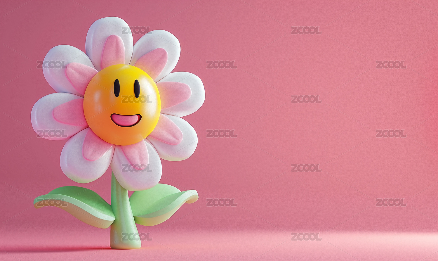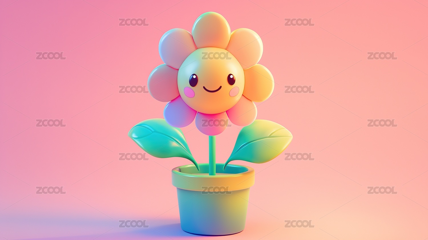 卡通风格的可爱花朵,粉色和绿色渐变的3D