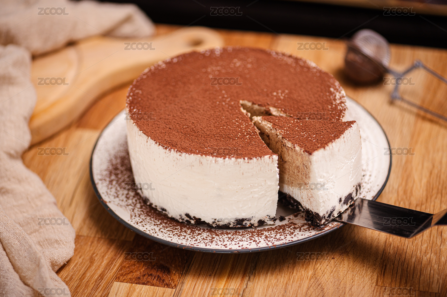 桌上新鲜的提拉米苏蛋糕 白色背景