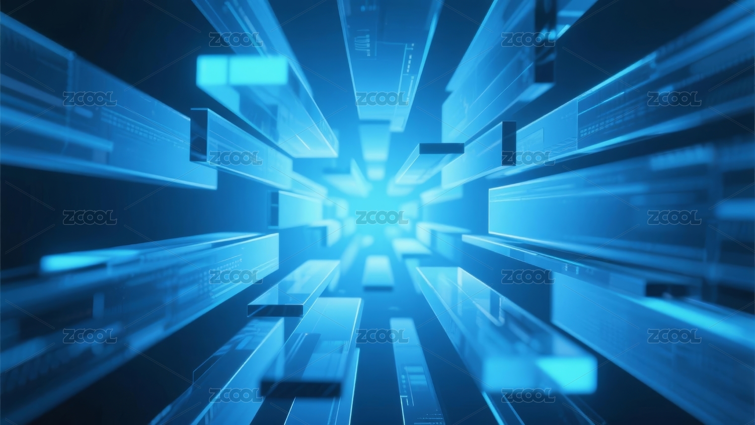 蓝色立体玻璃条块从中间向四周扩散背景