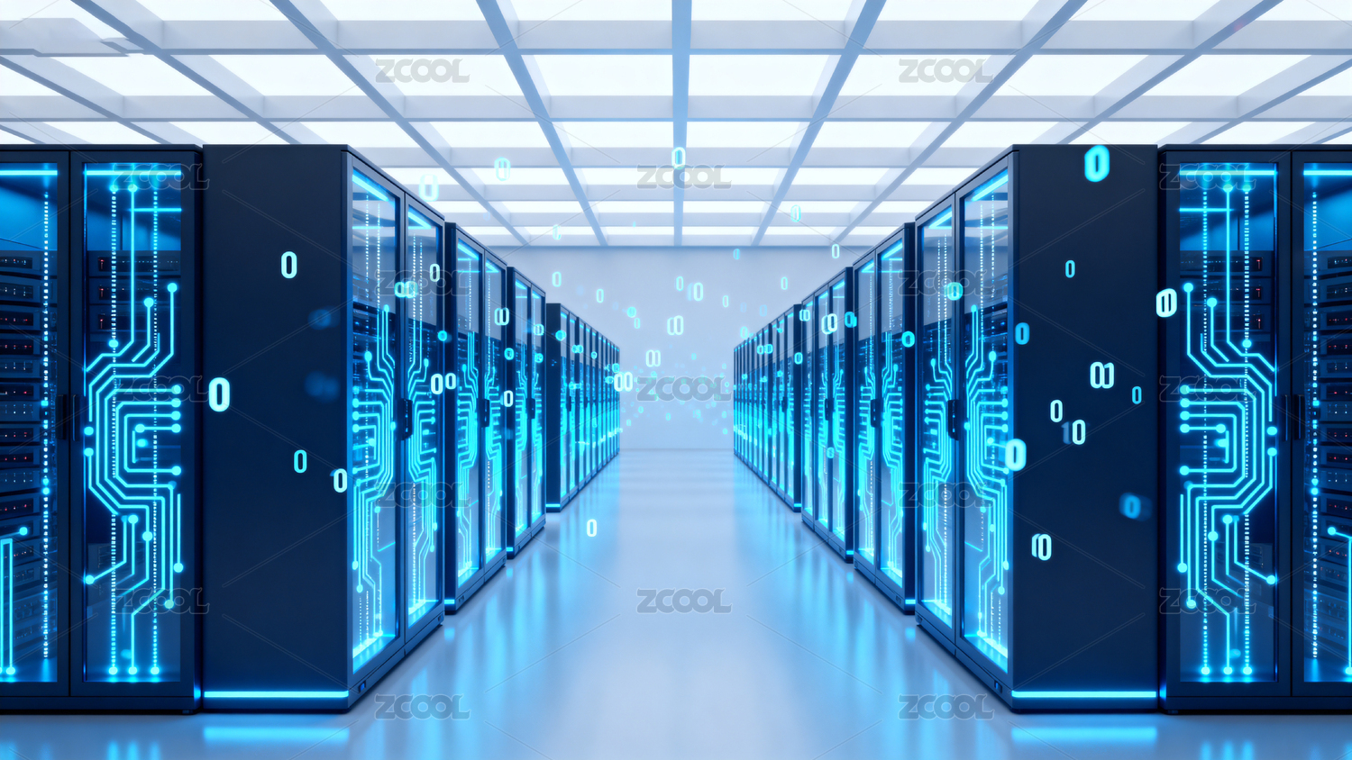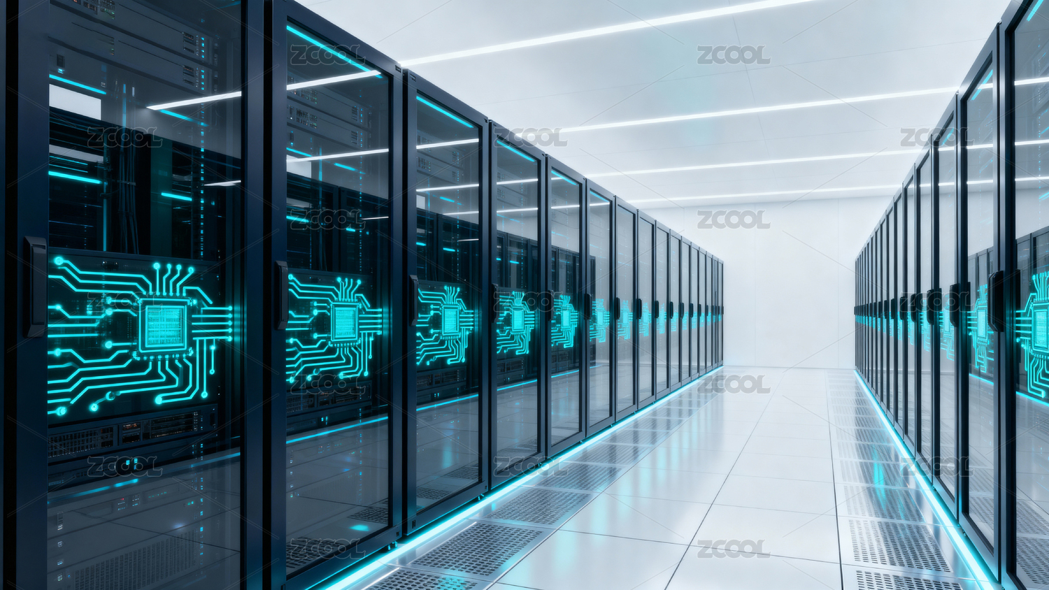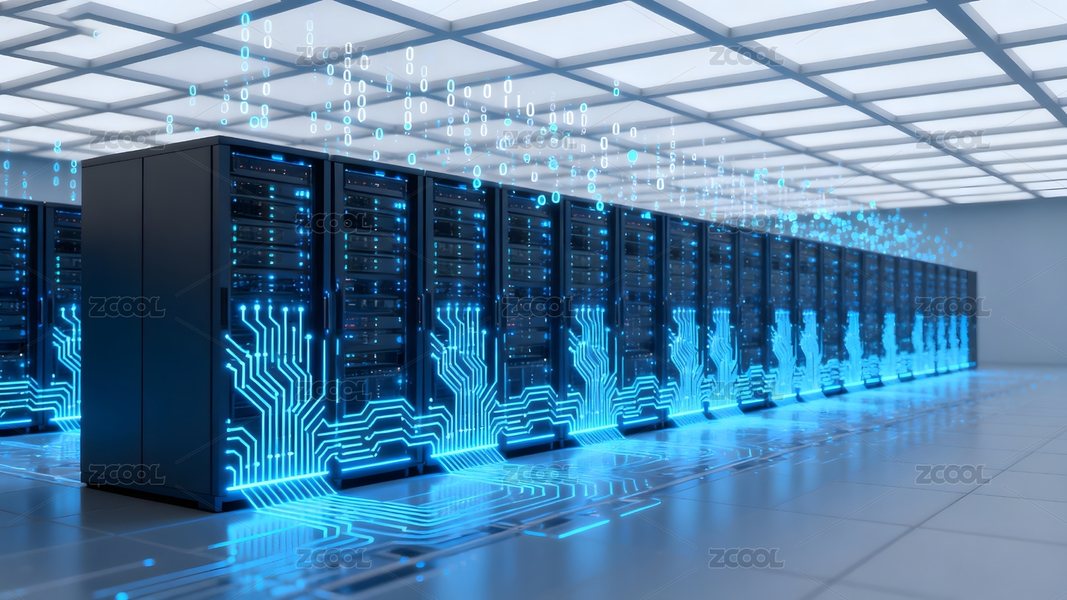 三维渲染的现代化高科技的服务器机房,强大的数据库和运算存储能力。
