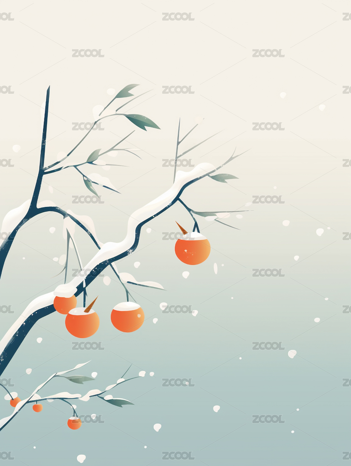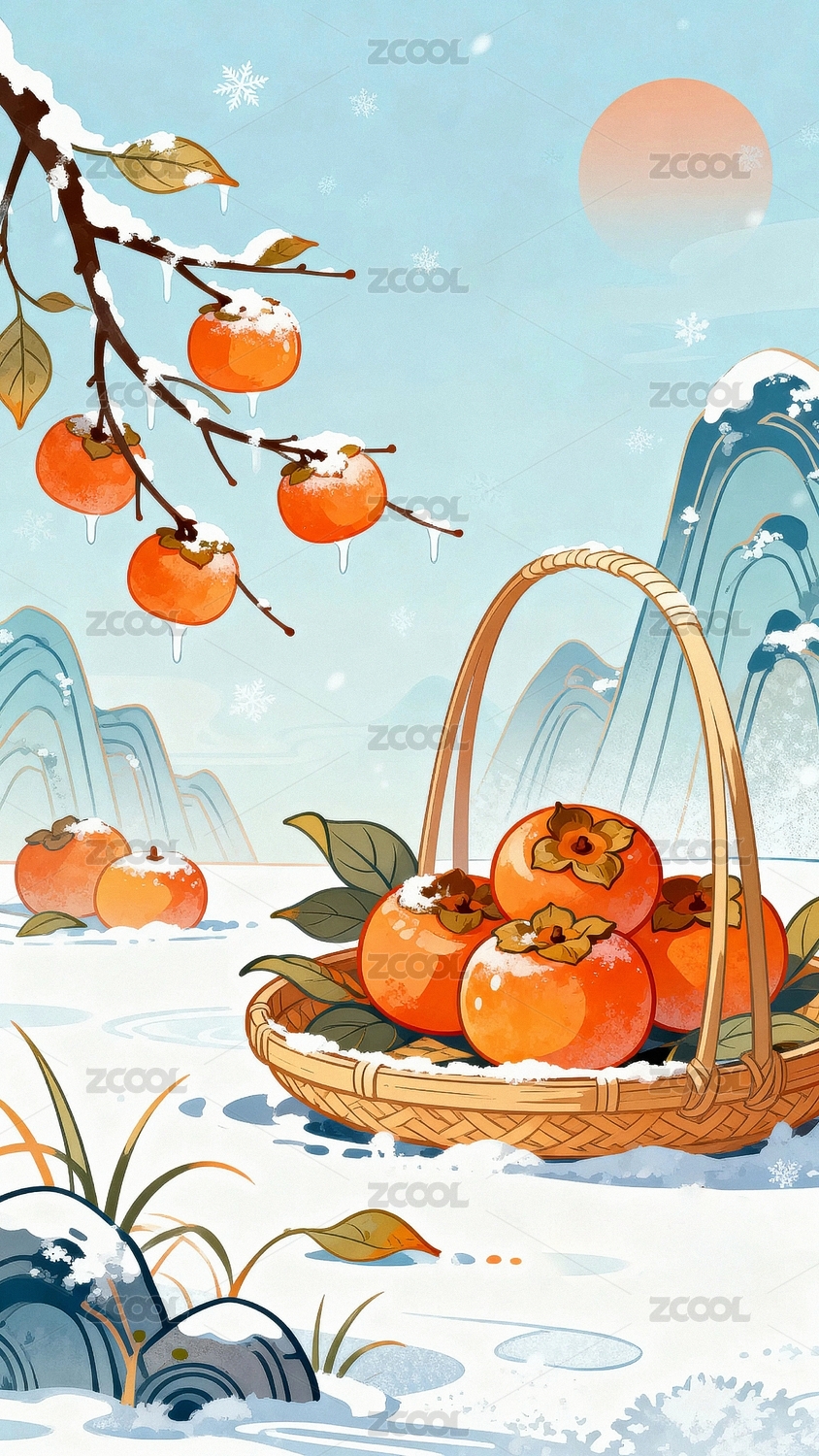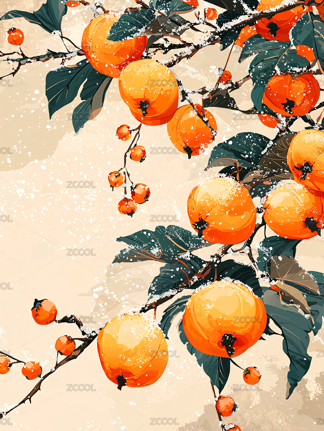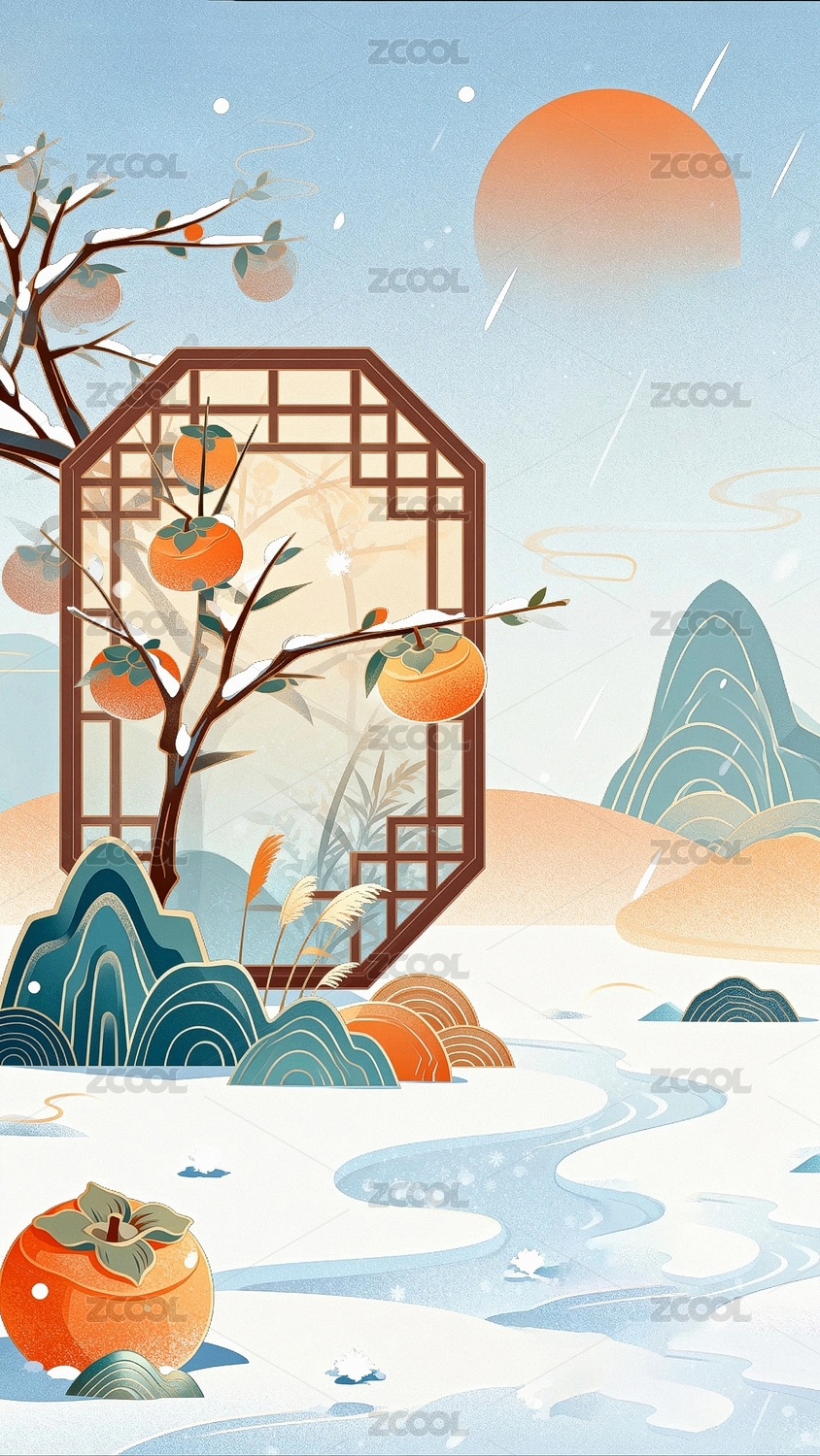 秋天霜降节气屋顶柿子树插画背景壁纸