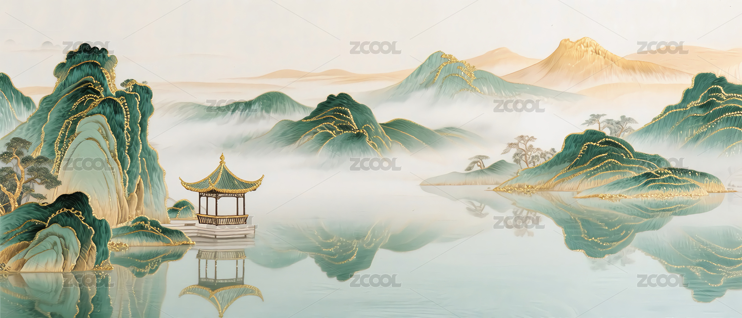 高山,绿色,金色,鎏金,华贵,天空,风景,水墨画,千里江山,树木