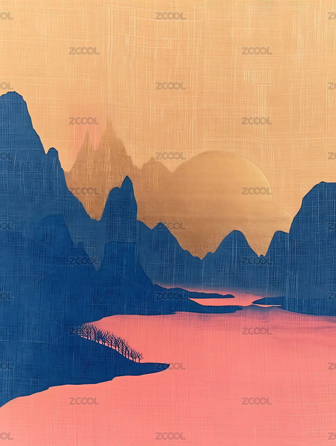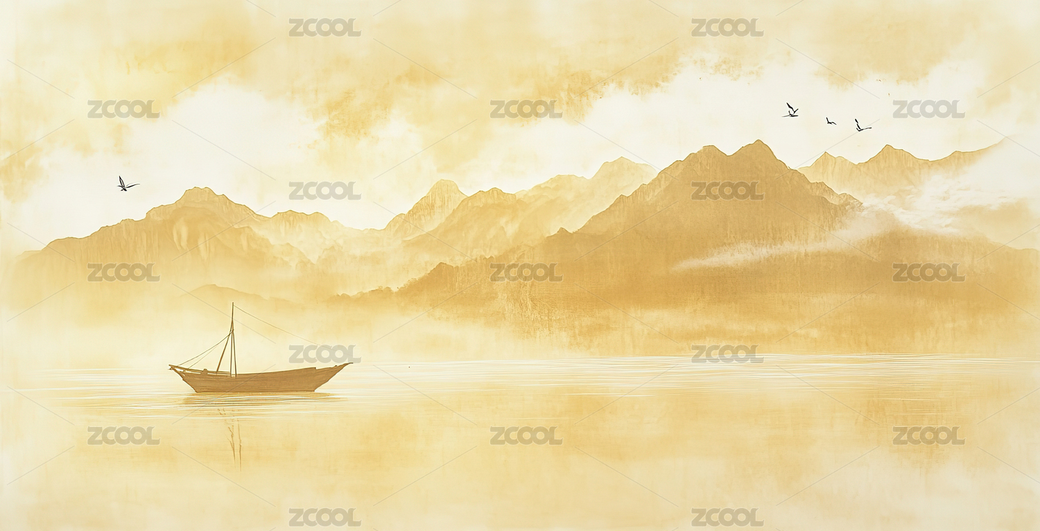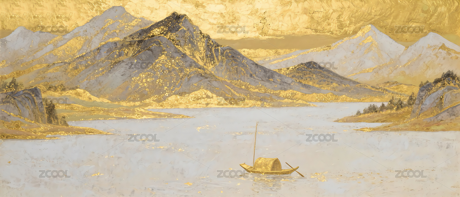 高山,水墨画,金色,鎏金,华贵,天空,风景,千里江山,树木,写意