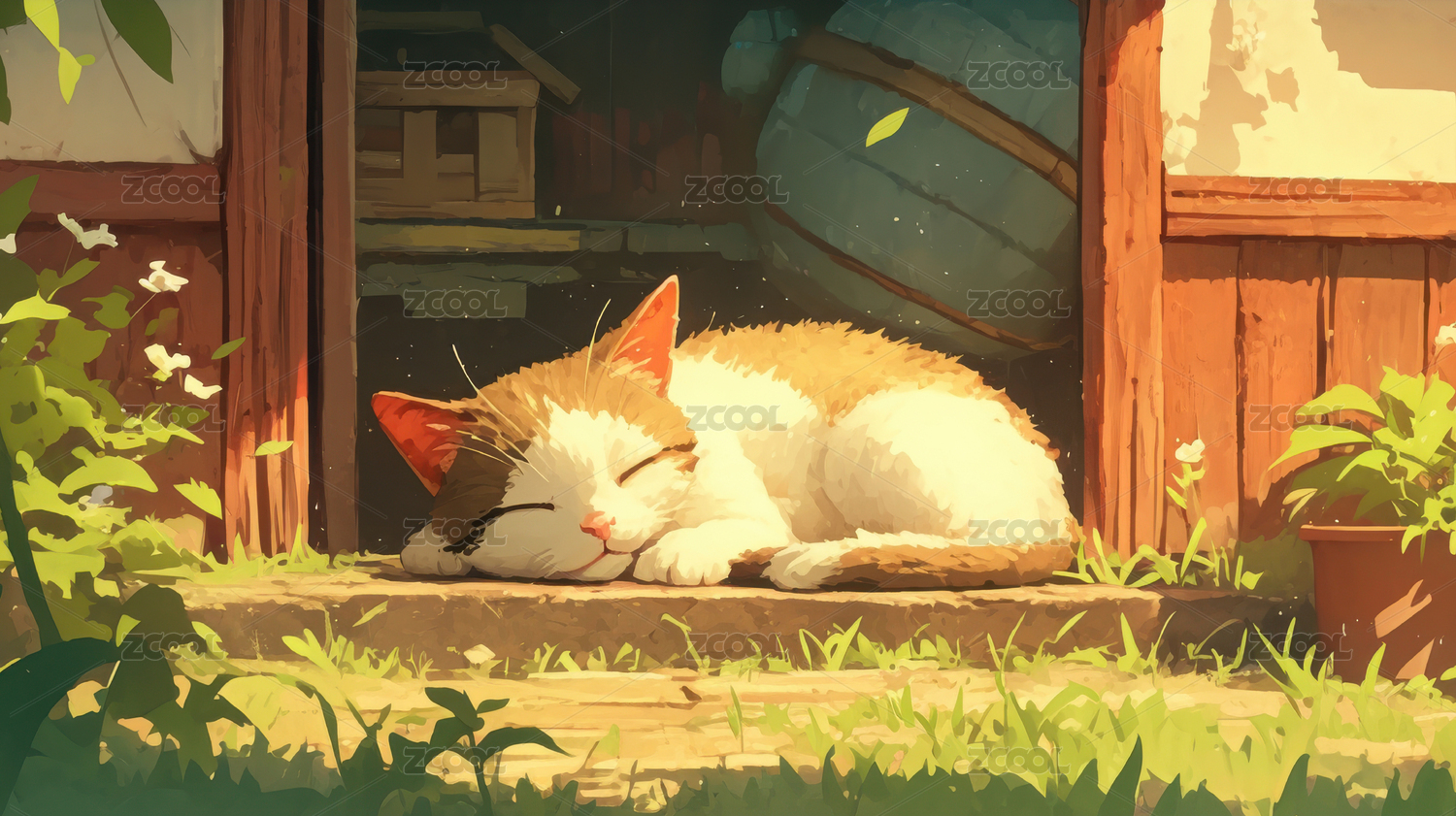乡村木屋阳光下休息的小猫卡通插画
