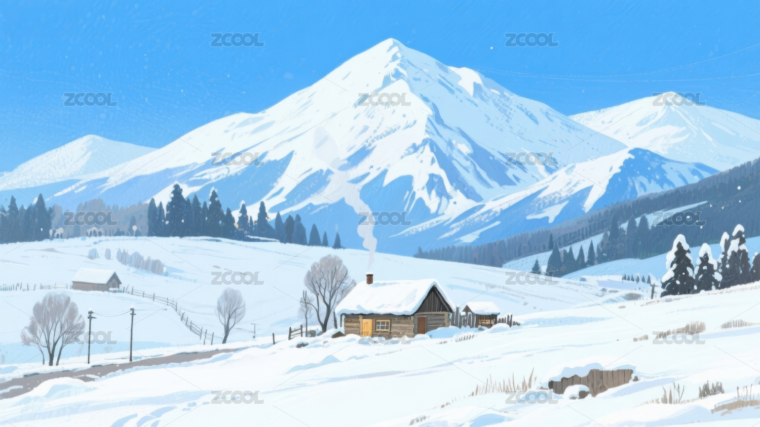 山脉,雪景,木屋,森林,冬季,插画,风景,乡村,雪地,房屋