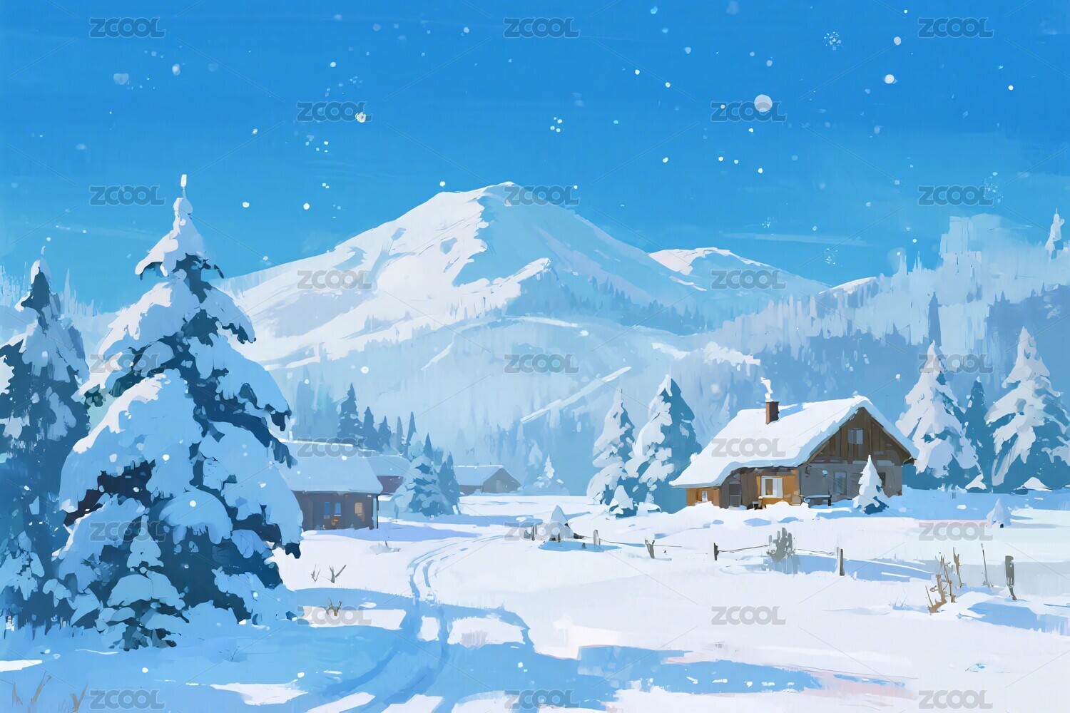 雪山,村落,木屋,雪地,树林,远山,蓝天,冬季,雪景,乡村